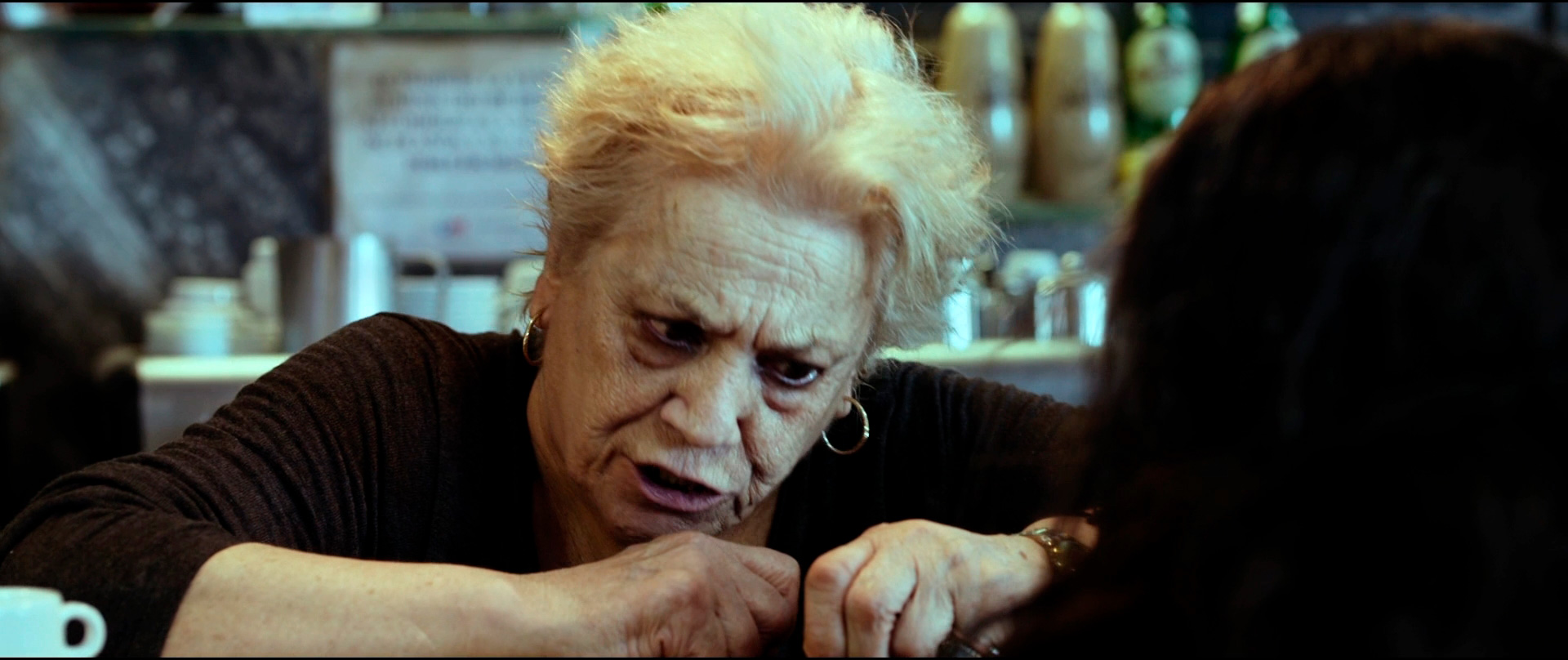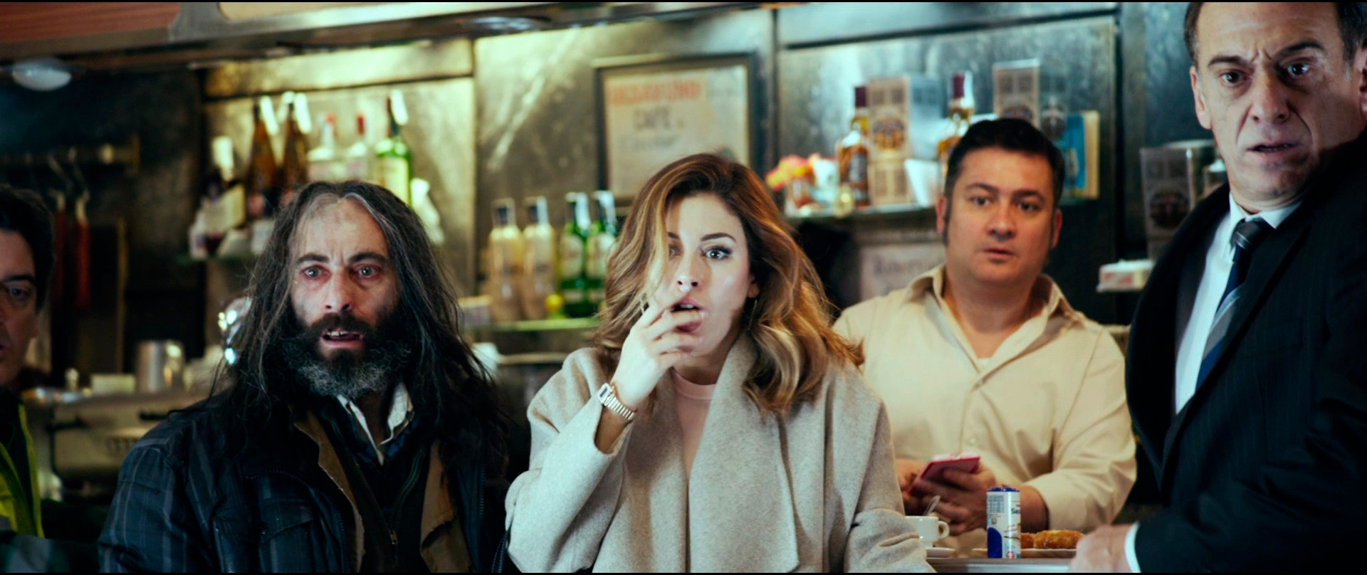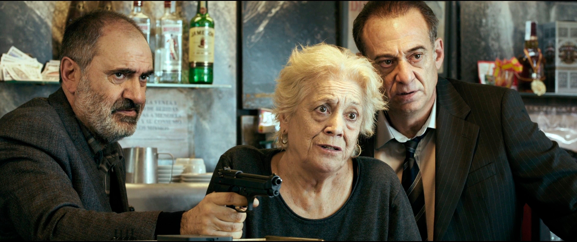 В баре работают властная хозяйка Ампаро (Тереле Павес) и ее забитый подручный Сатур (Секун де ла Роса). За стойкой сидит хипстер-креативщик Начо (Марио Касас), слушающий что-то в наушниках, в зале завтракают и пьют кофе два солидных мужика - один бывший полицейский, другой коммивояжер, также присутствует дама в возрасте с игровой зависимостью по имени Трини (Кармен Мачи) и еще несколько людей.
