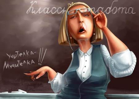 Что она там вещает? "Двоечники! Следует писать "Учительница — мучительница!!!""