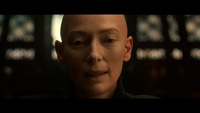 Я бы даже назвал этот устаревший предмет одежды главным героем фильма. В чем и обида, переигрывает он не только серенького актера Бенедикта Камбербэтча (Benedict Cumberbatch), но и саму леди Тильду Суинтон (Tilda Swinton). Да и, собственно, ей там нечего играть, кроме лысой головы. Она пытается серьезно произносить отвратительный бестолковый текст, часто моргает.