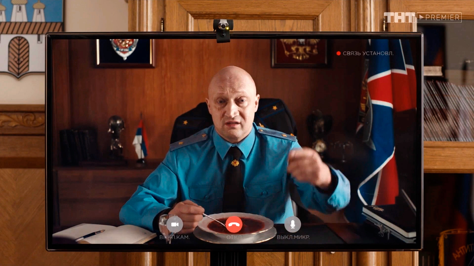 Доклады троицы по видеосвязи принимает генерал Круглов из Москвы, и для Гоши Куценко, который в роли этого генерала жжот вовсю, Слепаков придумал очень смешные, так сказать, мулечки.