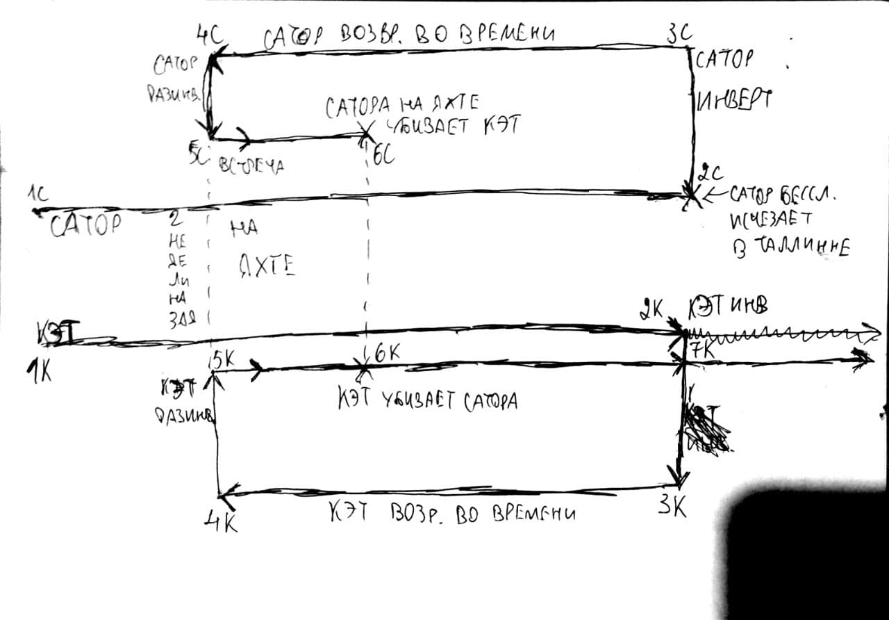 Сатор вернулся из Таллинна во времени примерно на две недели назад, чтобы самоубиться и активировать маячок на яхте, где они две недели назад отдыхали с женой. Соответственно, теперь в том времени два Сатора - вернувшийся через турникет из будущего, и живущий там в реальном времени, который через две недели вернётся на эту яхту. Кэт убивает первого, вернувшегося из будущего, второй живёт дальше, с ним происходят все события фильма, он возвращается назад, где его убьёт вернувшаяся назад Кэт.