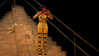 Очень интересно решен вопрос с декорациями - также очень новаторски. Центр сцены - вращающийся, на нем установлена пирамидальная конструкция с несколькими лестницами, ведущими к вершине пирамиды, а каждая грань пирамиды - это определенное место действия спектакля, причем часть декораций выезжает из-под сцены. Смотрится это оригинально и эффектно и нас с Бубликом явно впечатлило.