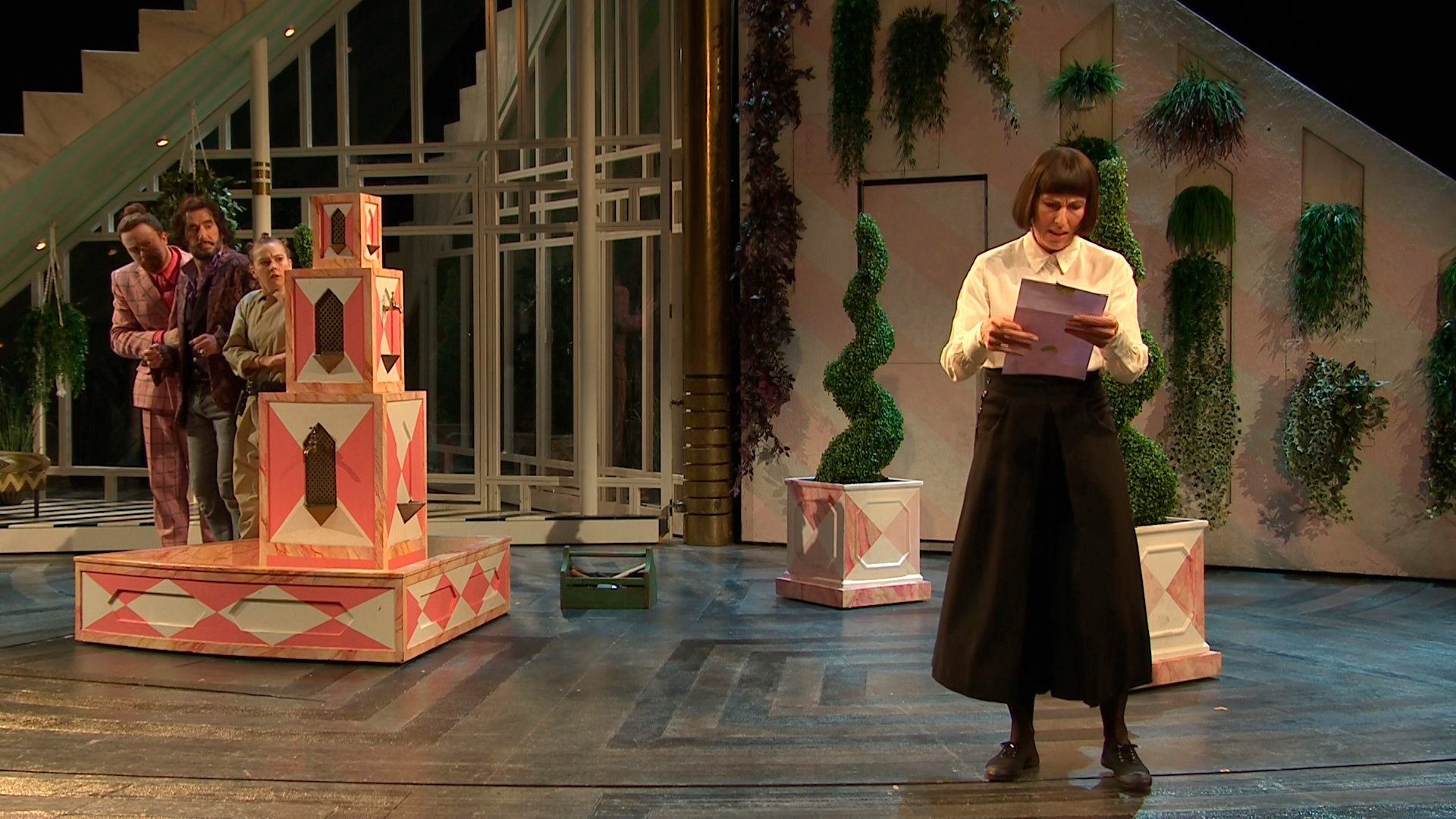 Вся сцена - в прямом смысле слова "у фонтана", то есть с получением письма - просто восторг! Как меняется Мальволиа, когда она вдруг узнает, что хозяйка к ней неравнодушна. Тэмсин начинает комиковать, не убирая с лица строгого выражения Мальволии, и это очень смешно: публика там угорает, как и мы с котом Бубликом. Тем более что, как и полагается по сюжету, шкодливая троица сэра Тоби, сэра Эндрю и слуги Оливии Фабии прячется по кустам, наблюдая за тем, как Мальволиа попадается в их ловушку, и с этой троицей есть истерически смешные моменты.
