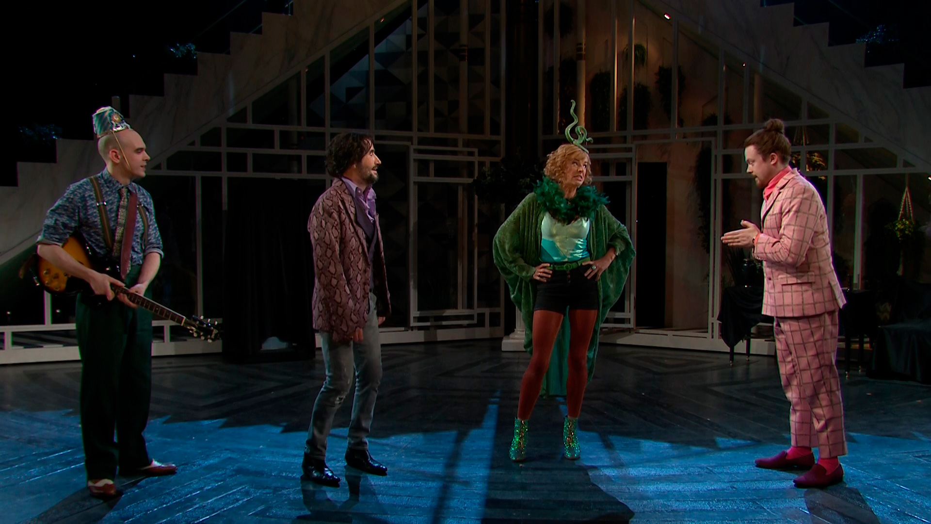 Отдельных слов заслуживает музыкальное сопровождение спектакля, написанное композитором Майклом Брюсом. Музыка очень четко вписывается в спектакль, музыканты при этом находятся на сцене и временами принимают участие в происходящем, помимо двух классных песен шута Фесте есть еще шикарная "Быть или не быть", исполняемая в ночном клубе "Элефант" со словами прямо по шекспировскому тексту артистом, одетым в стиле дрэг-квин.