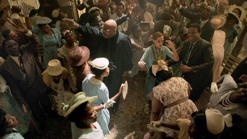 Как обычно у Лурмана, все очень пышно, блестяще и аляповато. Оно, может быть, и вполне подошло для рассказа об Элвисе, который в одежде и обстановке предпочитал конкретный китч, но здесь все это уж как-то слишком гротескно: кажется, что ты смотришь не фильм о реально существовавшем певце, оказавшим огромное влияние на всю современную музыку, а тебе показывают какой-то кинокомикс о Злодейском Паркере (грим у Хэнкса все-таки достаточно карикатурный, как и манера разговора полковника) и Хорошем парне Элвисе.