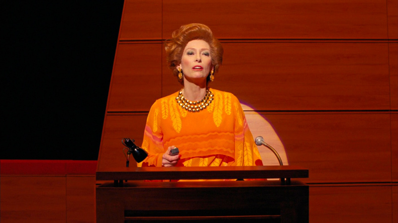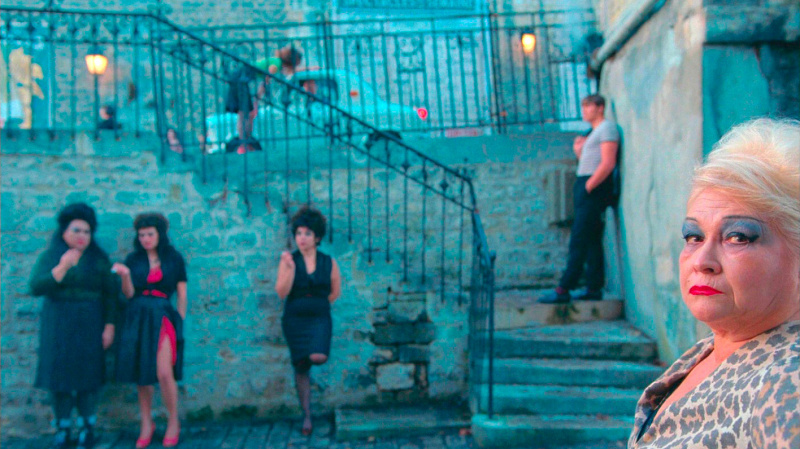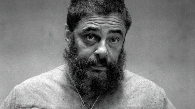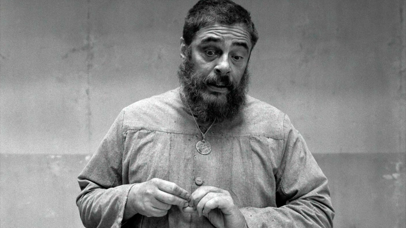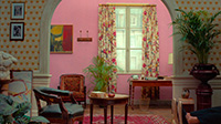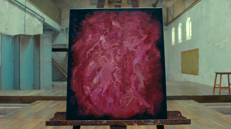 Новелла "Железобетонный сюжет" снята в совершенно ином стиле. Историю художника рассказывает арт-журналистка (имеющая, кстати, реальный прототип, как я читал), в которой очень трудно узнать Тильду Суинтон (она до этого сыграла в двух фильмах Андерсона и принимала участие в озвучке его анимационного фильма "Остров собак") - яркие и даже кричащие цвета, которые вдруг резко сменяются черно-белой палитрой истории сумасшедшего художника, нашедшего свою музу в тюремной надзирательнице. И лишь только на какие-то несколько секунд в этой истории вдруг появляются цвета, когда режиссеру нужно показать, как на самом деле выглядели картины Розенталера.