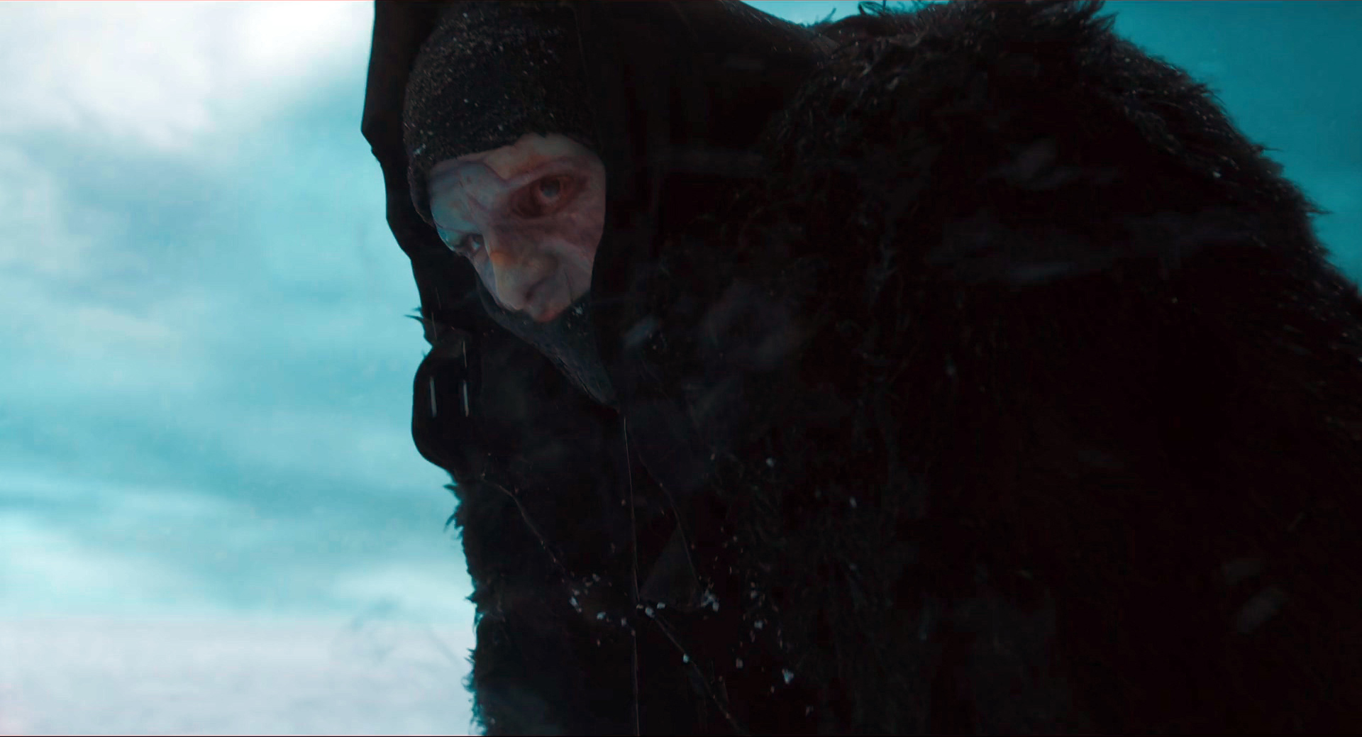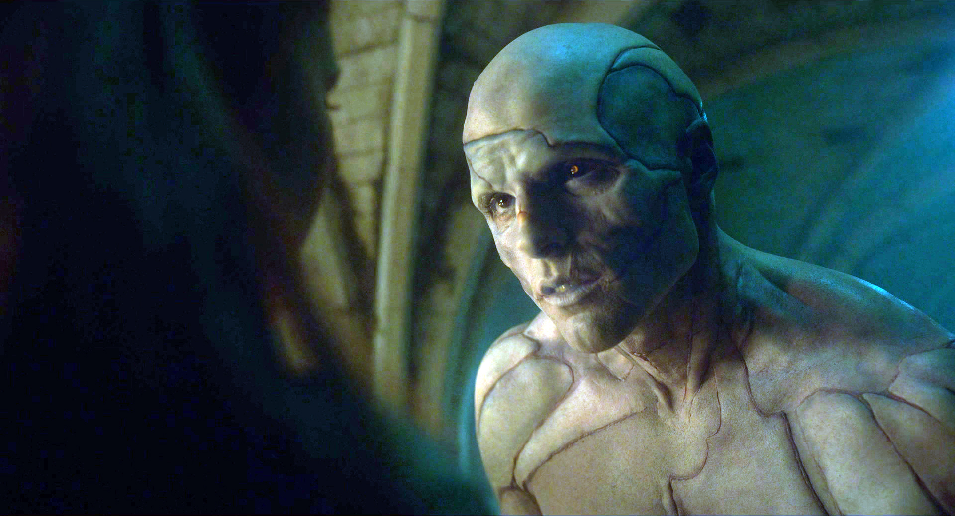 И там с точки зрения грима и постановки было интересное решение: первоначально Существо выглядит пугающе, его лицо и тело сшито из разных кусков, оно двигается как какой-то кадавр (я читал, что Элорди для движений Существа использовал элементы японского танца буто), но позже, когда Существо проходит определенный путь развития, на его лице постепенно проявляются человеческие черты.