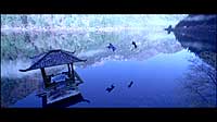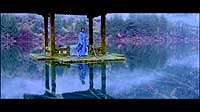 Во-вторых, антураж сцен боев. Сражение Безымянного с Небесным происходит во время дождя - во дворе здания, куда Небесный приходит поиграть в вей-чи. Дождь сопровождает все это действо, и я никогда не предполагал, что дождь можно снять так красиво. Другое сражение - Безымянного со Сломанным Мечом - происходит на зеркально-гладкой поверхности горного озера. Они скользят, сражаясь, по поверхности воды, причем снято это с совершенно различных точек, включая глубину. Оружие касается озера, вздымая в воздух крупные капли воды... В общем, это просто нужно видеть...