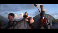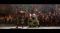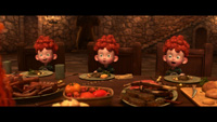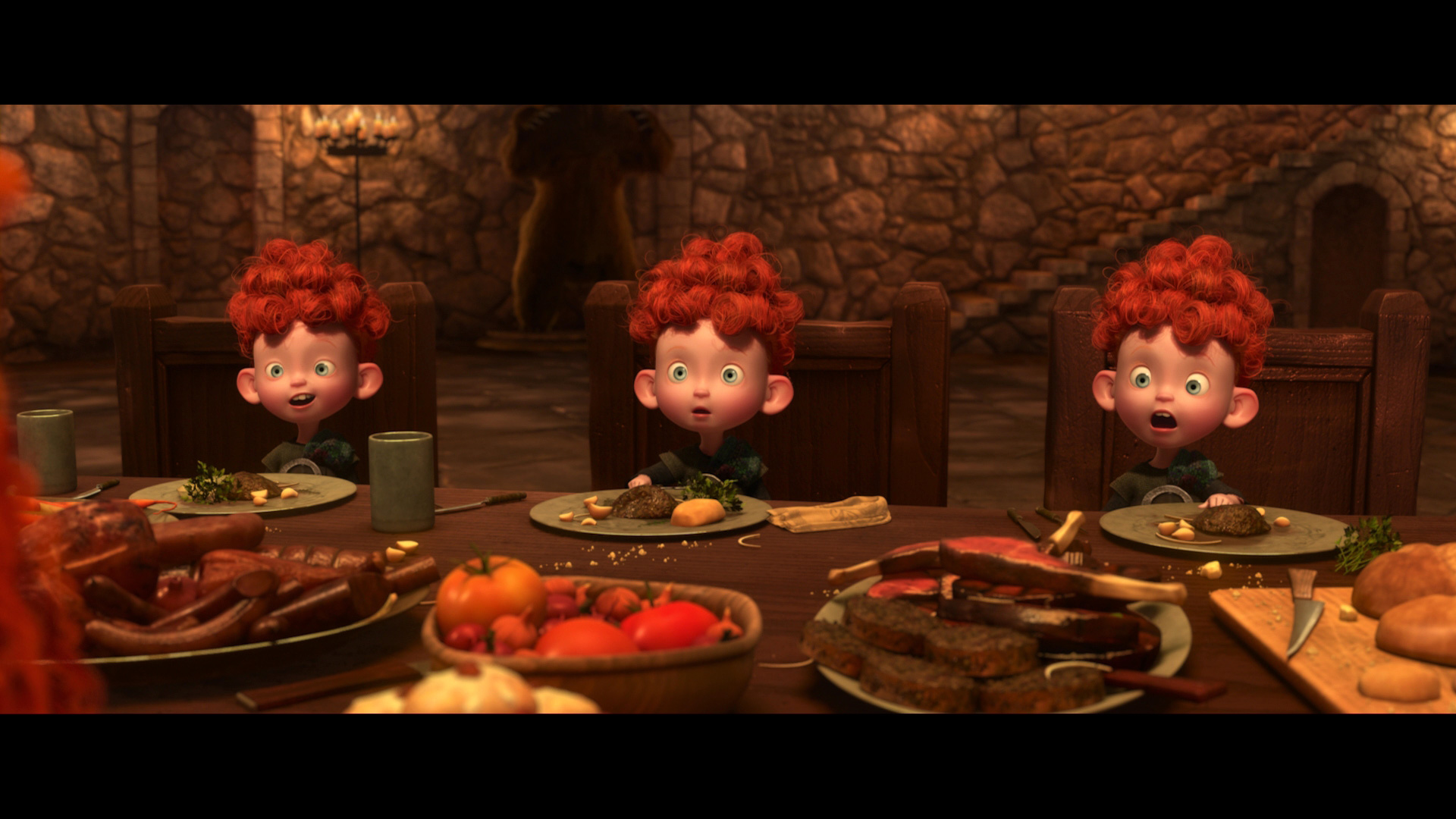 Когда Мерида была маленькая, на их семью, путешествующую по неким надобностям, напал огромный медведь. Папа Фергюс доблестно сразился с медведем, потерял при этом часть ноги, но зато приобрел полное право на всех пирах коротенечко, на часочек, рассказывать во всех подробностях историю этого жуткого сражения, каждый раз приукрашивая рассказ все новыми и новыми живописнейшими деталями.