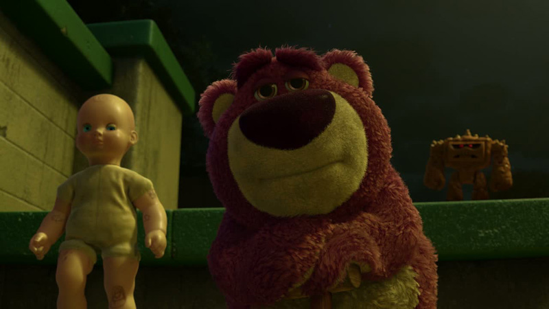 Затем оказалось, что Лотсо - не такой уж и розовый. Этот медведь имеет серьезное криминальное прошлое и правит игрушечным миром детского сада стальной лапой при помощи своих клевретов. Любое неповиновение жестоко наказывается, и перед Лотсо никто не смеет даже и пикнуть. Шестерки Лотсо вместе с самим медведем благоденствуют в старшей группе, где дети умеют обращаться с игрушками, а на долю группы игрушек Энди выпал ад младшей группы, причем избежать этого им уже не удастся - все выходы охраняются и сбежать из тюрьмы почти невозможно.
