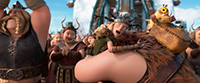 Кроме того, некоторые персонажи, которые были обозначены в сиквеле легкими штрихами, вышли на первый план, и многие из них - очень и очень забавны. Самая прикольная парочка - брат с сестрой Задирака (Джастин Раппл) и Забияка (Кристен Уиг). Задирака связывает свои длинные волосы под подбородком, делая вид, что носит бороду, и постоянно пытается наставлять Иккинга на путь истинный. А Забияка невероятно болтлива, и там самая смешная сцена в фильме - когда она попадает в плен к Гриммелю и изводит его болтовней до того, что он ее пинком отправляет на свободу. Впрочем, сцена, когда Беззубик пытается ухаживать за дневной фурией, а Иккинг ему подсказывает, тоже очень веселая.
