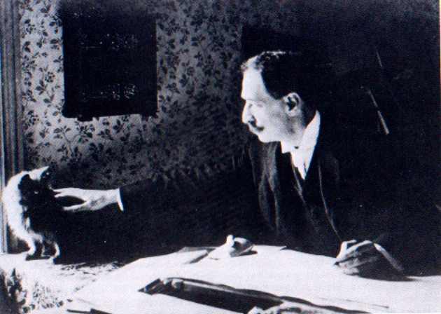 Луис Уэйн за своим рабочим столом вместе с Питером. (Кстати, имя коту было дано в честь российского царя Петра Первого Великого.)