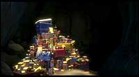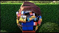 Но жадность сослужила Ар Джею медвежью услугу. Он захапал почти все припасы, загрузил их в любимую мишкину красную тележку и только собрался было улепетнуть, как еще одна упаковка "Картофана" сбила енота с панталыку, он засыпался, попал под медвежью лапу, после чего полная тележка съедобного барахла упала в глазах медведя и енота прямо с обрыва.