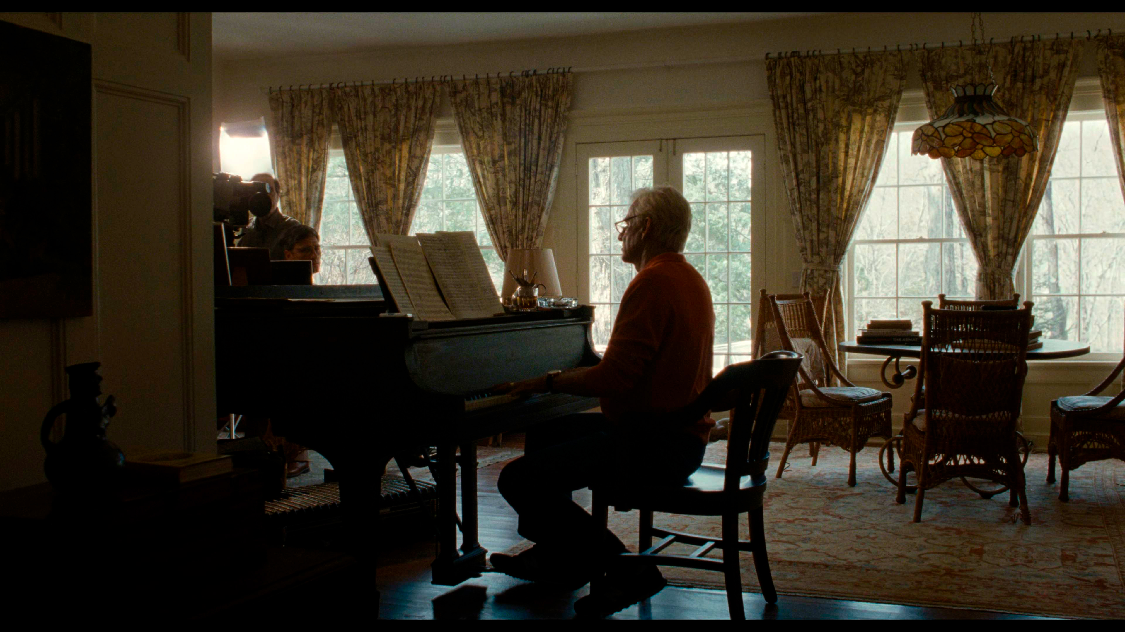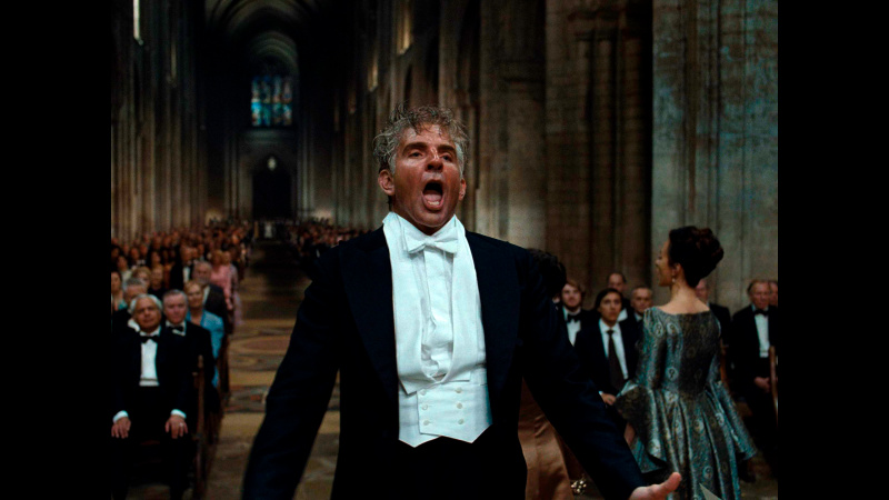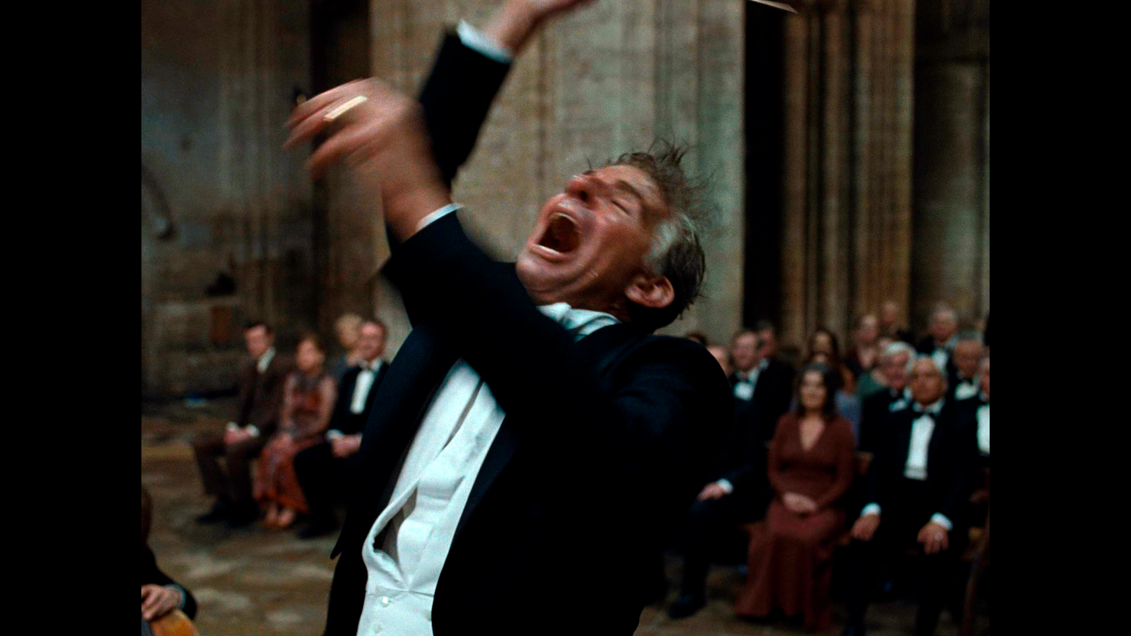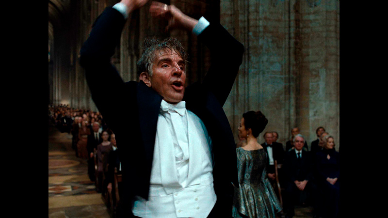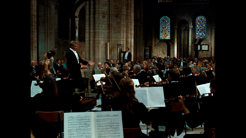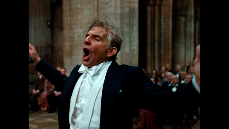 Сцена в фильме, где Леонард Бернстайн дирижирует Лондонским симфоническим оркестром, исполняющим его "Мессу" в соборе Эли в 1976 - действительно шедевральная. Она длится 6 минут и 21 секунду, снималась вживую, Брэдли изучал манеру дирижирования Бернстайна по сохранившейся необработанной записи этого исполнения и, по его собственным словам, он потратил шесть лет на обучение дирижерскому мастерству. И эта сцена снята совершенно замечательно, она производит очень большое впечатление.