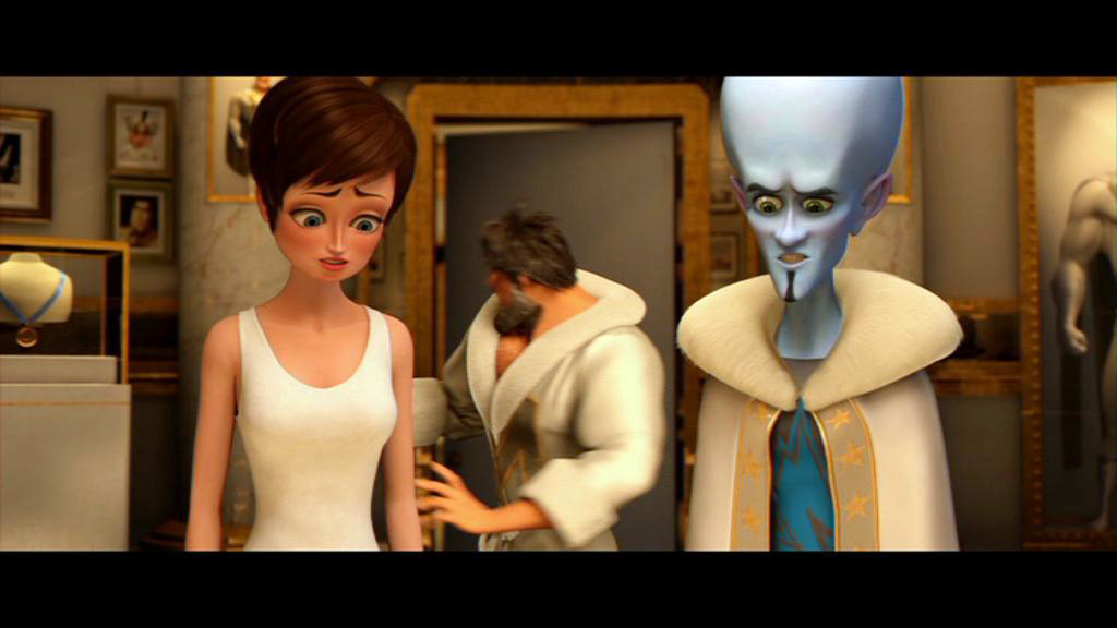 И сначала это все кажется очень и очень вторичным: не особенно понимаешь, в чем там суть. Потом, конечно, все проясняется: во-первых, любовная история между голубым снаружи, но розовым внутри Мегамозгом с Роксаной, во-вторых, неизбежный переход Мегамозга на сторону Добра в тот момент, когда появляются два Зла и ни одного Добра для баланса и паритета. Ну и, собственно, что любовная история, что переход сил Зла на сторону Добра - они тоже пародийны и вполне предсказуемы.