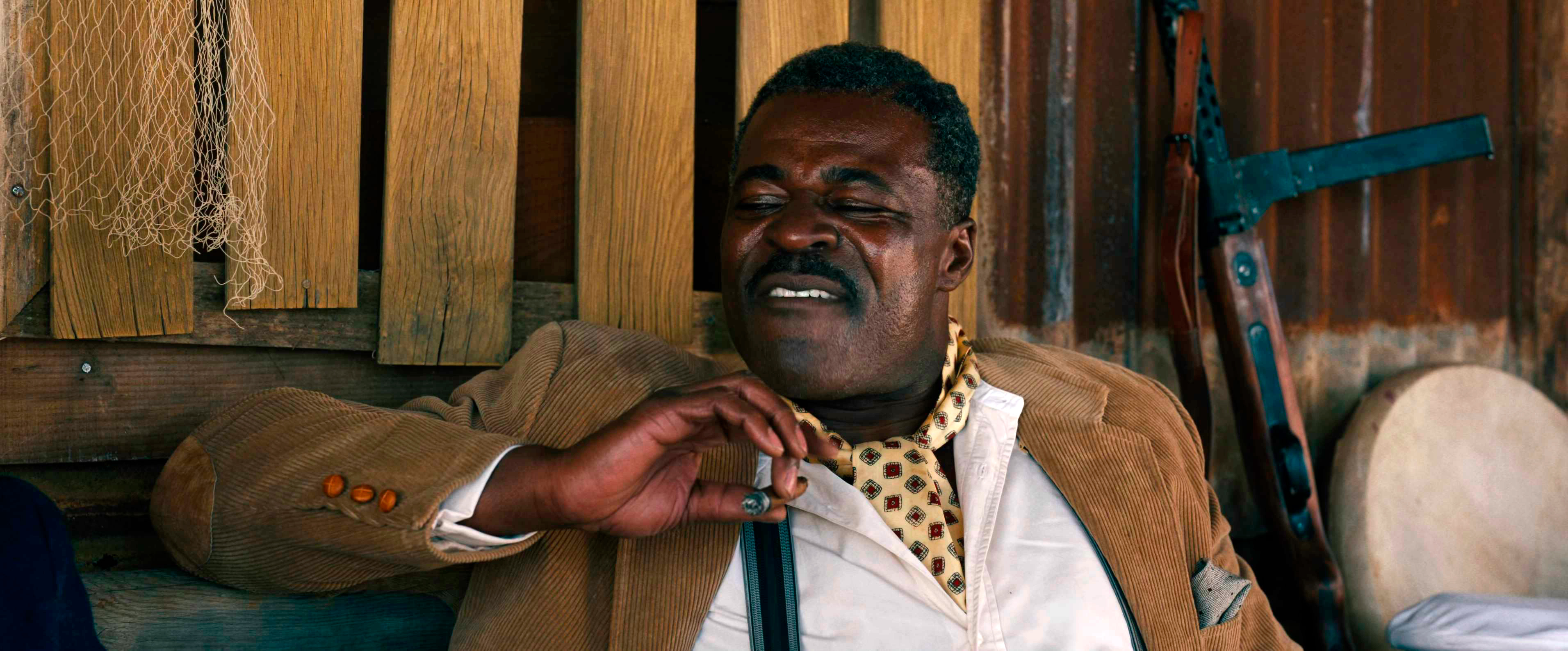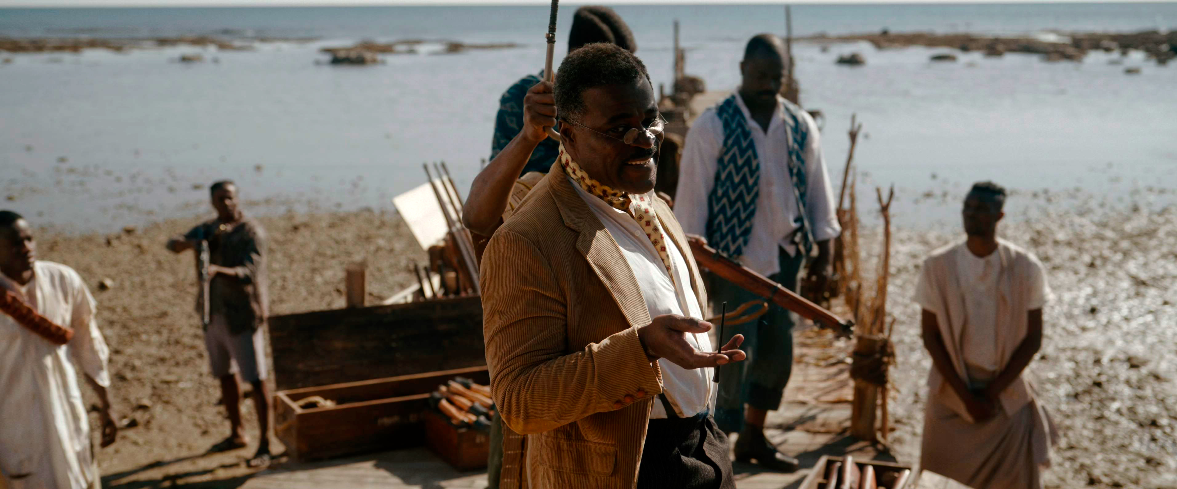 Немецкий офицер разговаривает по-английски с главными героями в поезде, который едет по Африке.