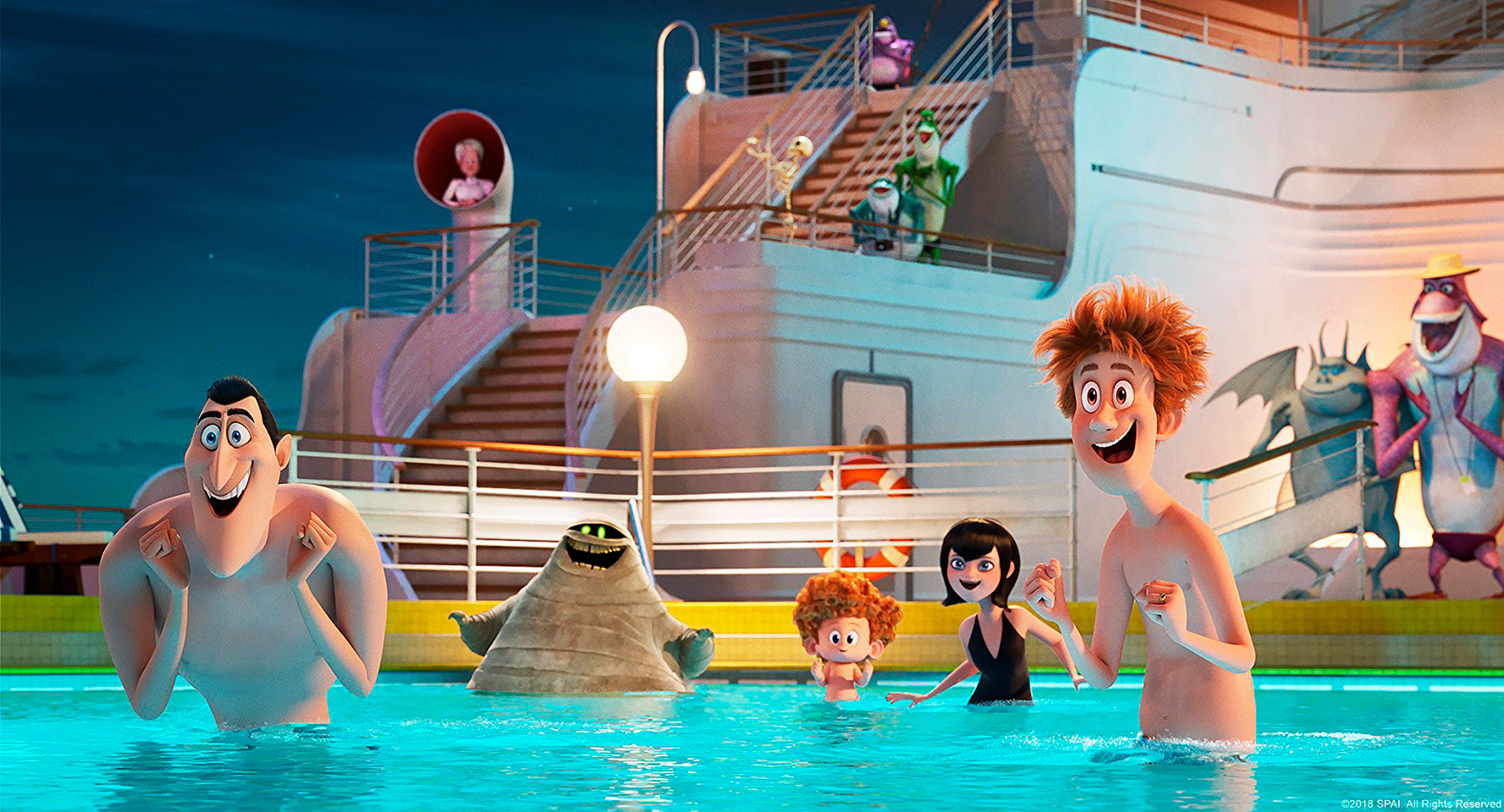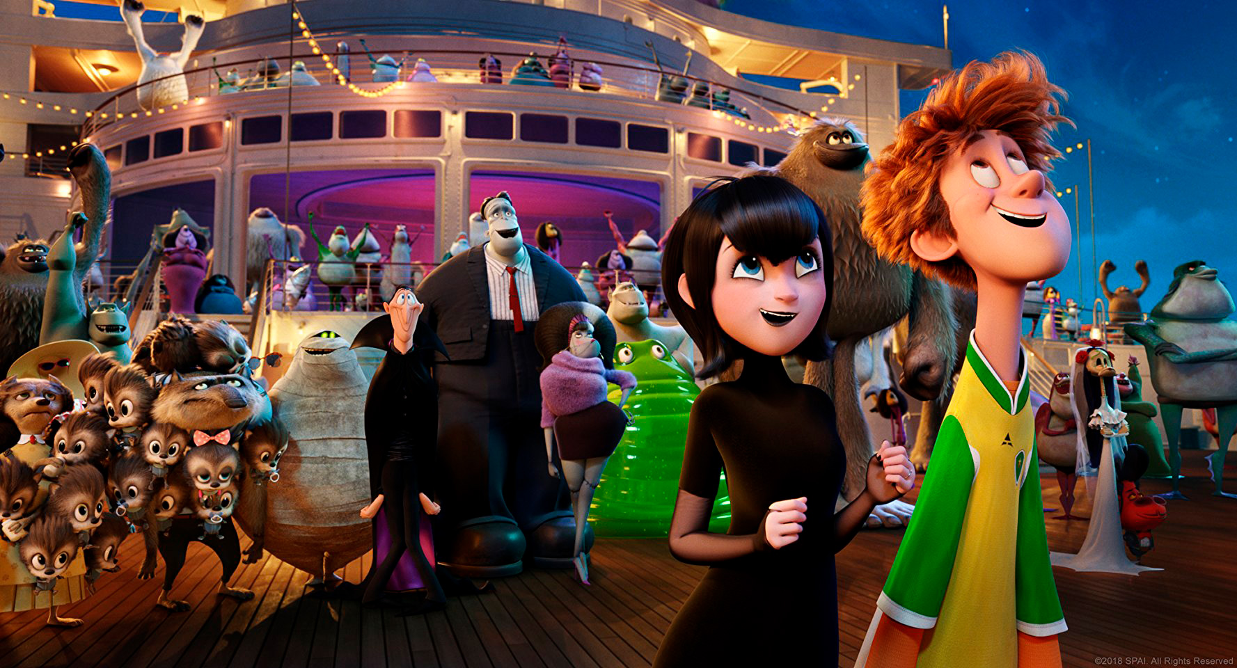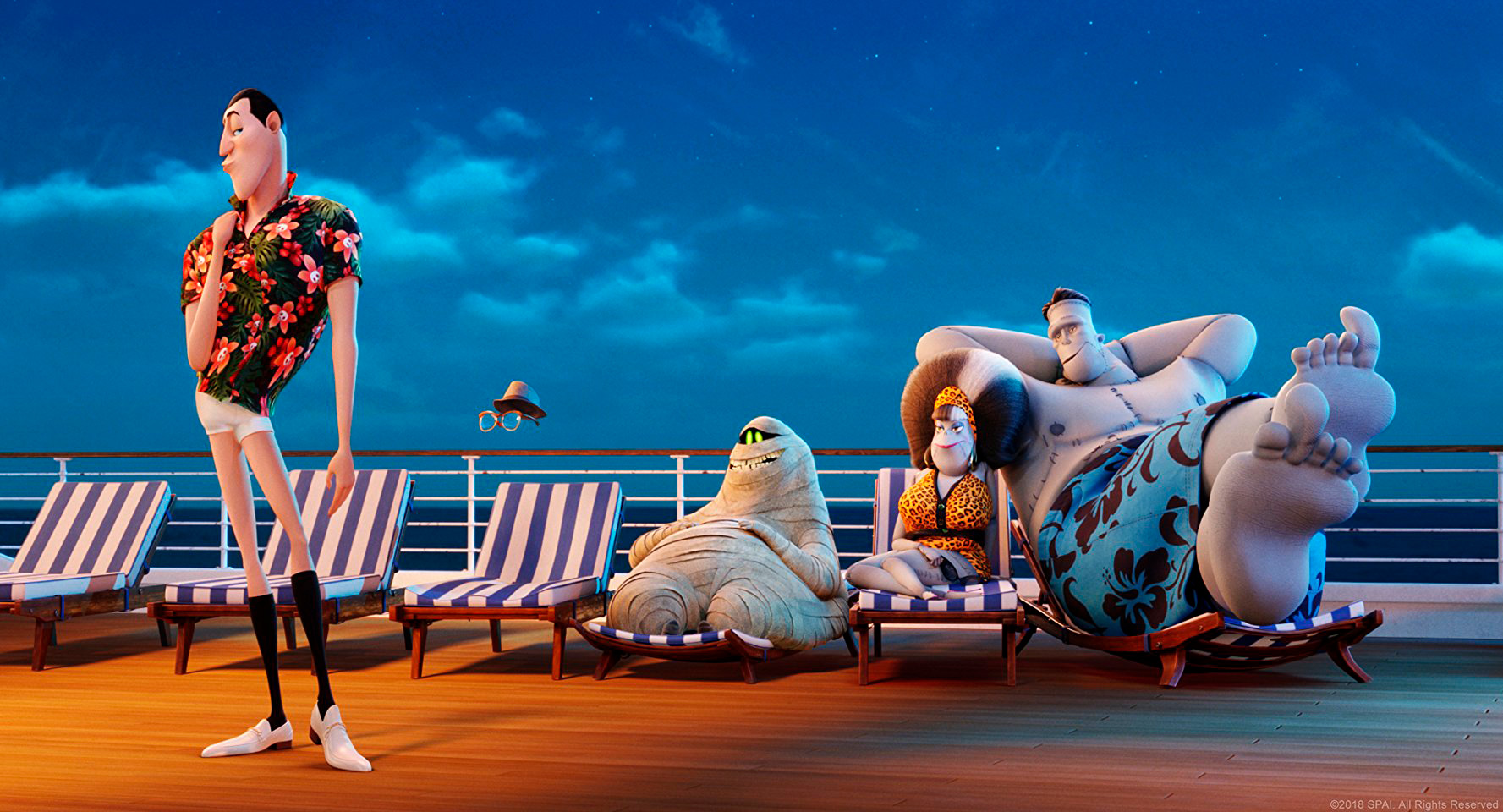Дракула, который не любит сюрпризов, отказать дочке не может, поэтому, скрипя сердцем, отправляется в поездку, причем перелет на самолете гремлинов до места дислокации лайнера хорошего настроения им всем не прибавил. Однако лайнер оказался очень комфортным, а капитан корабля прекрасная Эрика (Кэтрин Хан) настолько не оскорбила зрительный нерв Дракулы, что он даже почувствовал в себе некие эмоции и, можно сказать, воспарил.