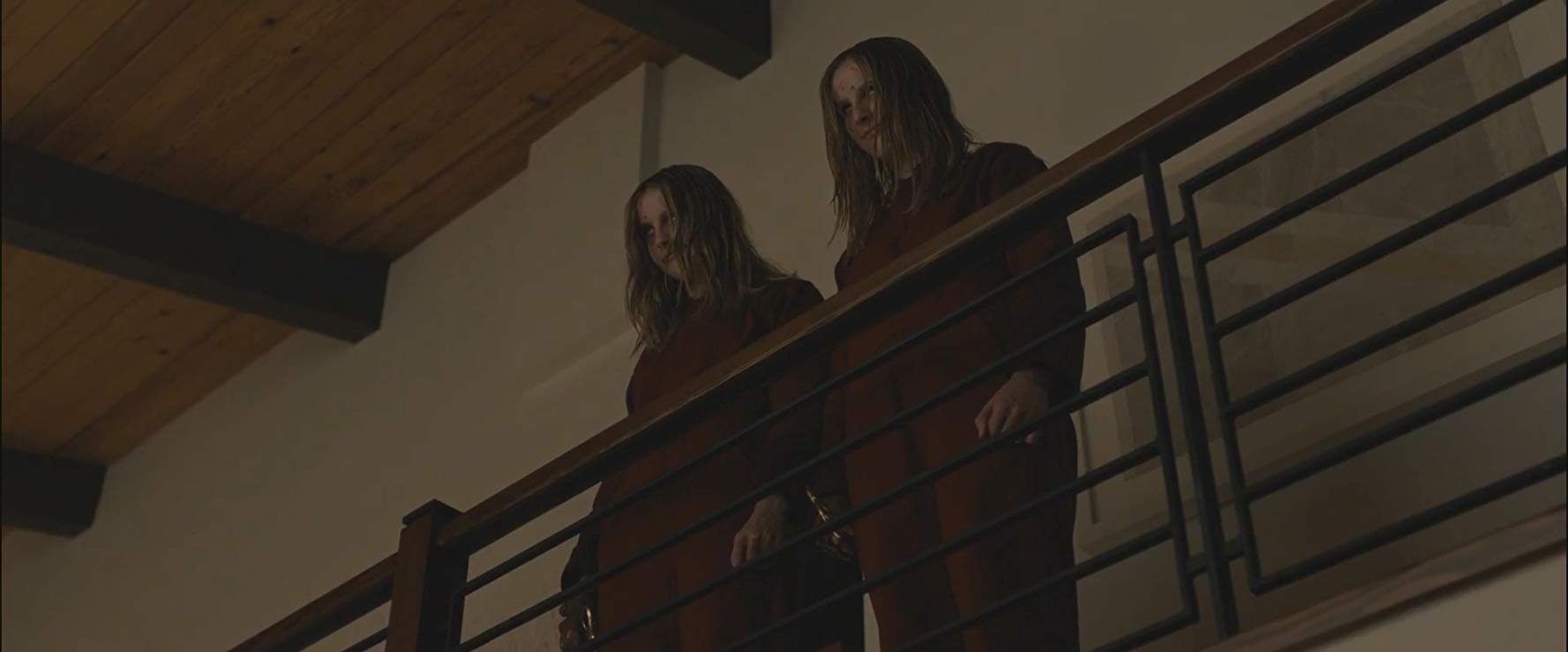 В начале фильма главная героиня попадает в одно из таких подземелий, где клон душит ее и наружу выбирается именно копия, а «оригинал» остаётся в подземелье. Это становится ясно, когда нам рассказывают о детстве героини, о том, что она потеряла речь на долгое время после того случая в лабиринте (ведь «клоны» немые). С другой стороны и голос «тёмной половины» звучит приглушено, потому что её душили когда-то, да и говорить с немыми клонами ей было явно особенно не о чем. Более того, сын главной героини – такой же «подменыш». Он обгорел в детстве и мама-Тень отвела его в «нижний мир», взяв на смену невредимого ребёнка. Это становится понятно только в финале, когда «уродца» отправляют в огонь.