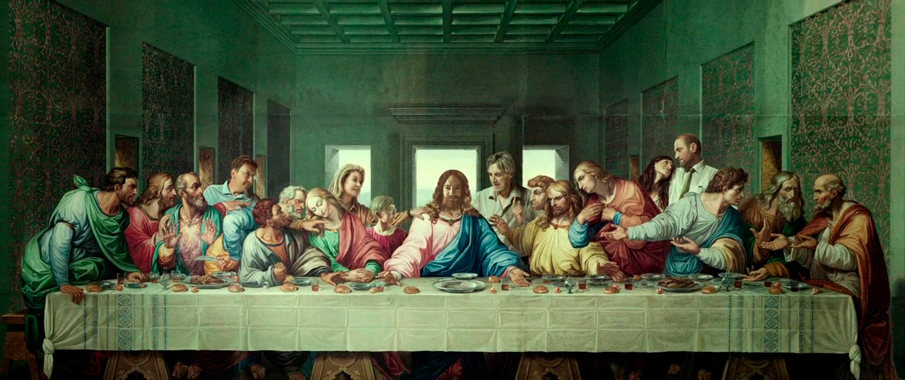 Шум вокруг этой картины в основном был вызван якобы содержащейся в ней антиклерикальной направленностью, однако я тут ничего такого сильно антиклерикального не заметил. Подумаешь, Бог-отец придумал, что бутерброд всегда будет падать вареньем вниз, - тоже мне проблема. На фоне того, что Бог (если он, конечно, существует) творит со всем человечеством, бутерброд, как мне кажется, является наименьшим злом.