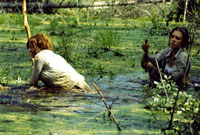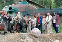 Поначалу, конечно, Кирилл с Ольгой все время ссорятся. Кириллу не нравится, что Ольга не умеет выживать в лесу и писать с плота, а Ольга презрительно называет Кирилла таксистом и намекает, что именно она - главная в этой миссии. Но после того как в озере опять что-то взорвалось и миссионеров захватили в плен белогвардейские офицеры, которые еще с Гражданки скрываются в лесах и по сей день пускают под откос поезда этой большевистской сволочи, Ольга с Кириллом постепенно перешли на "ты", и зрителям уже понятно, что финальный закопченный поцелуй все-таки состоится.