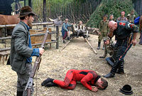 Да, в виде придирочного уточнения: назвать то, что происходит в фильме между мазуровой спутницей и злодеевой подстилкой, "ножевым боем" - это всё равно что назвать испанской корридой забивание быка на колхозной бойне. Наша агентесса по сюжету не владеет этим самым боем - поэтому её хватает лишь на пару беспомощно-панических тычков ножом в сторону противницы. Смотрится без интереса и удовольствия, лишь с жалостью. Да и вообще, оживлять кино поединком двух девиц в обтягивающих брючках - мало того, что опять же давно обыграно Голливудом, так и ещё и сделано здесь "по-РУССКИ!!1111 АРРРРРГХХХ!!!!1111", т. е. уныло и скучно.
