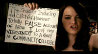 В остальном все смотрелось вполне живенько и забавно. Актриса Эмма Стоун, исполняющая главную героиню, сильно напоминала Линдси Лохэн в ее добуйном варианте - например, в "Чумовой пятнице". Стоун сыграла хорошо, смотрелась ярко, и благодаря ей в процессе просмотра даже как-то не особенно обращаешь внимание на несуразности сюжета.