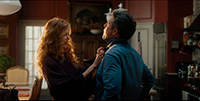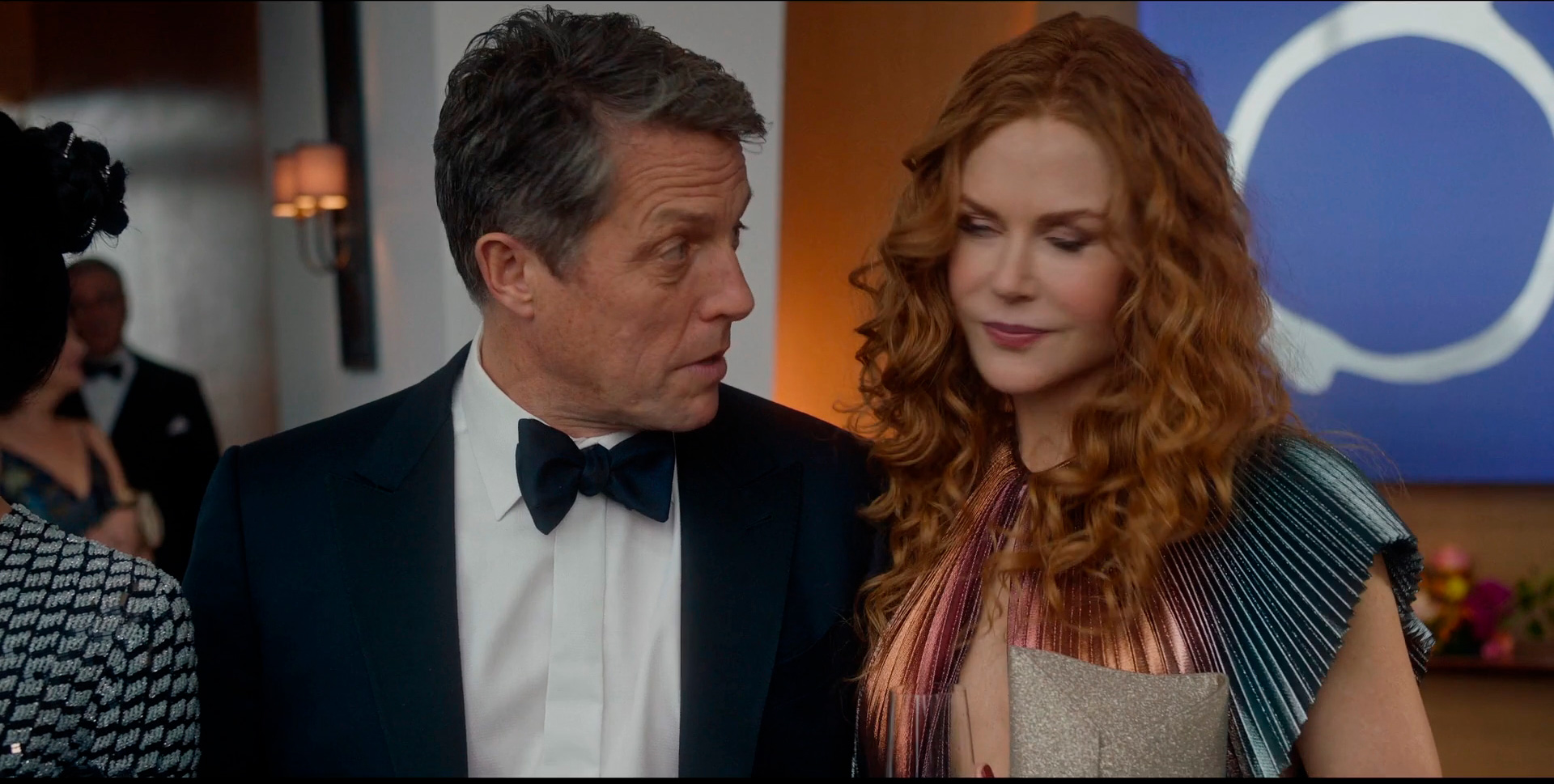 Хью Грант здесь - просто отличный. У него как раз на лице четко отразились его шестьдесят лет, но он этого как раз совершенно не стесняется и не пытается как-то скрыть свой возраст. И мне Хью Грант в этом возрасте нравится заметно больше, чем его старое амплуа красавчика "Микки - голубые глазки" (хотя еще раз повторюсь, что как раз фильм с этим названием, где Грант сыграл, неожиданно хороший). Грант совсем недавно отлично сыграл в шикарных "Джентльменах", а сейчас и здесь - очень яркая роль, причем на фоне совершенно безэмоциональной Кидман Грант развернулся вовсю!