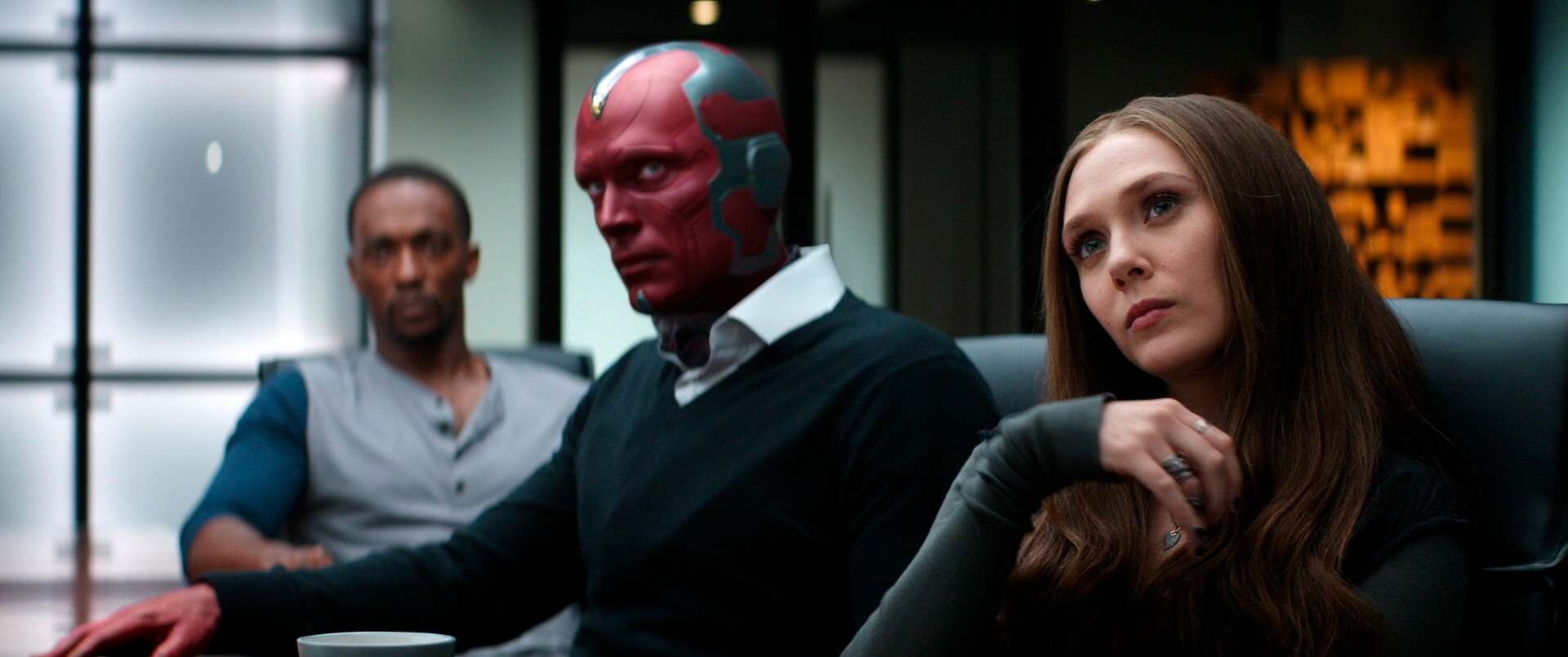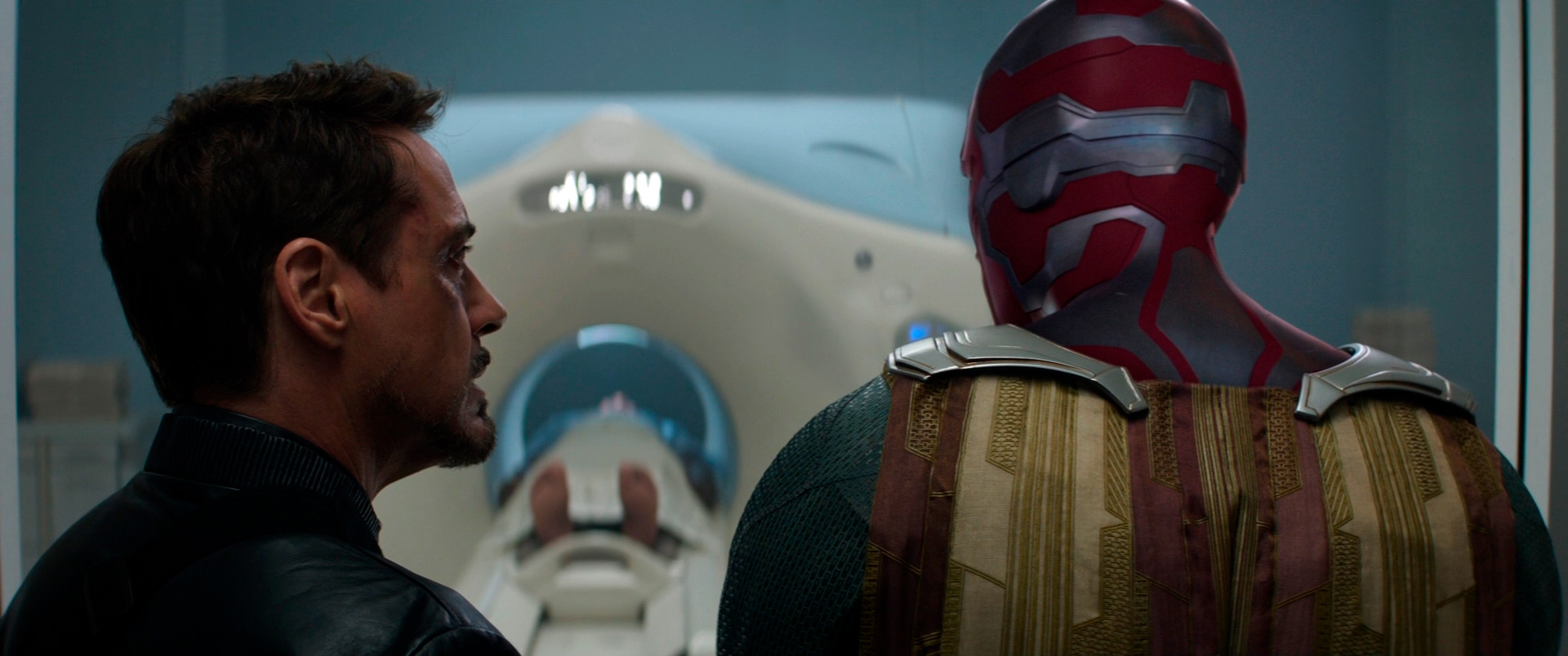 В это время Железный Человек получает выволочку от госсекретаря за самоуправство Мстителей, берет с собой Черную Вдову (Скарлетт Йоханссон), Воителя (Дон Чидл) и Вижена (Пол Беттани) - и отправляется с ними арестовывать непокорную часть Мстителей, не подписавшую "Заковианский договор".