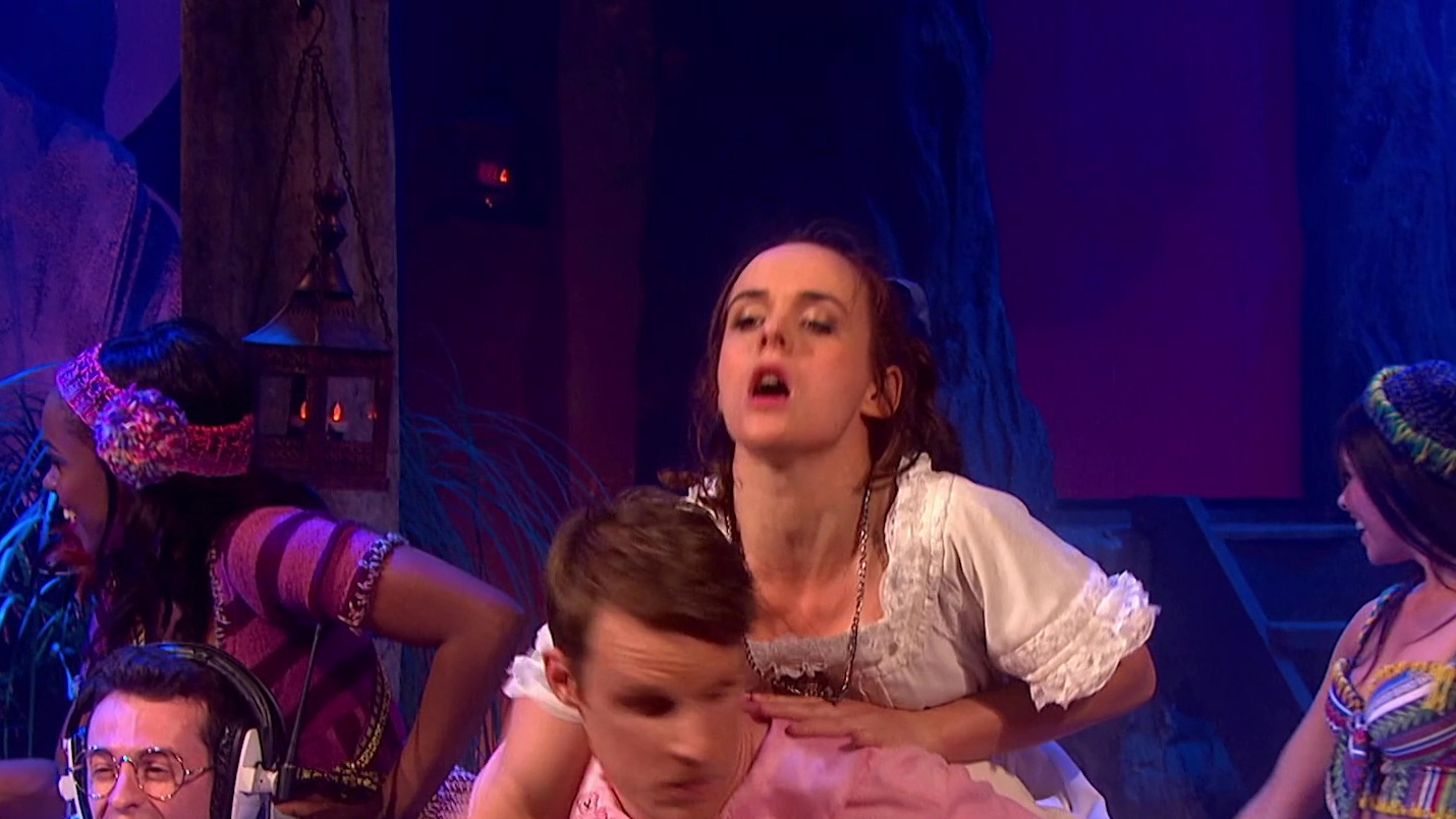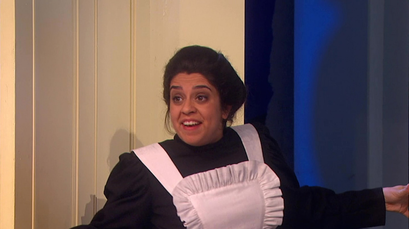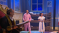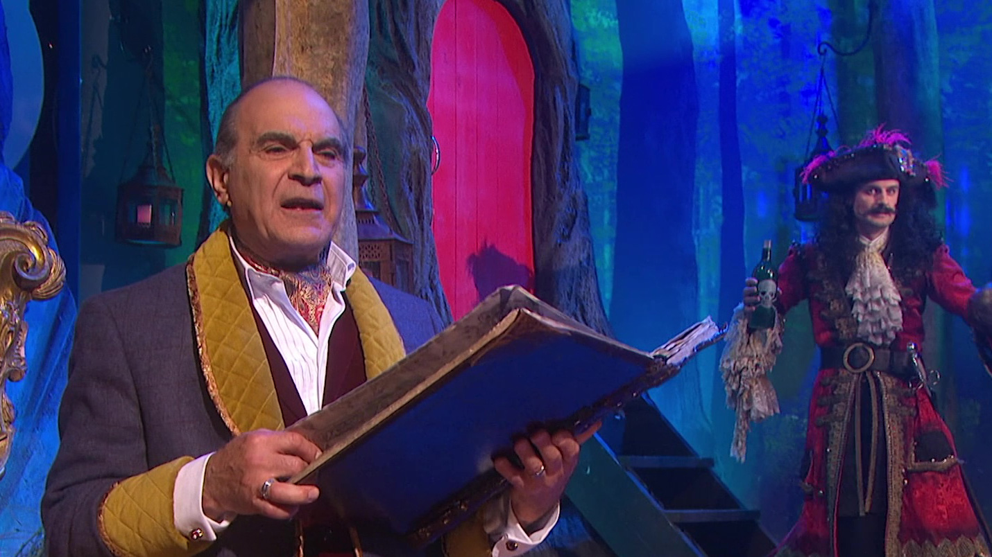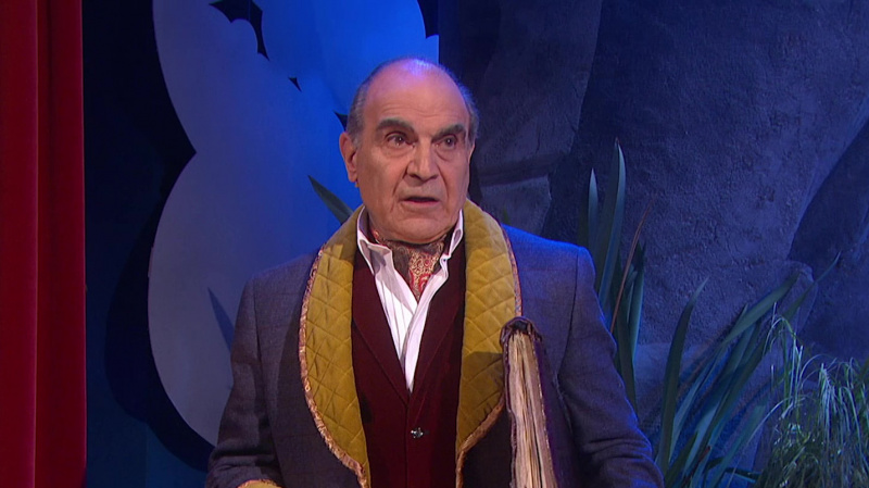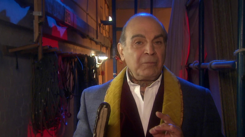 В качестве специально приглашенной звезды выступает Дэвид Суше - легендарный "Пуаро" из одноименного сериала, - и на его долю придется немало страданий - как, впрочем, и на долю других участников постановки. Дэвид будет зачитывать отрывки из "Питера Пэна", вспомнит один грустный эпизод из постановки, в которой он участвовал, также ему выпадет важная роль как-то отвлечь публику во время очередного ужасного происшествия на сцене. И Суше тут был просто великолепен.