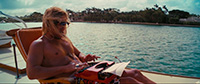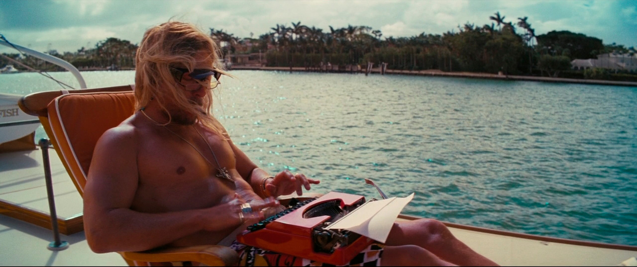 При этом нам показывают, что, даже катаясь на каком-то суденышке с девками и другими обдолбышами, Лунный Пес временами что-то строчит на пишущей машинке - пишет новые стихи.