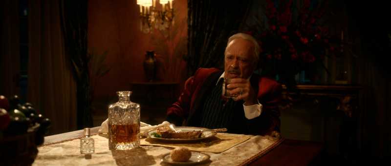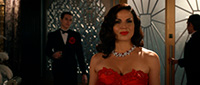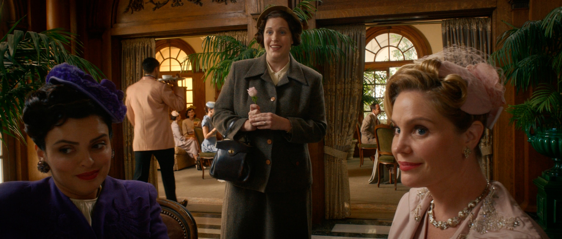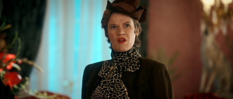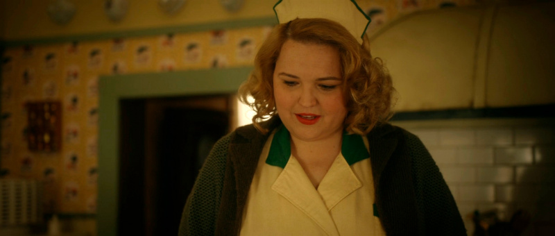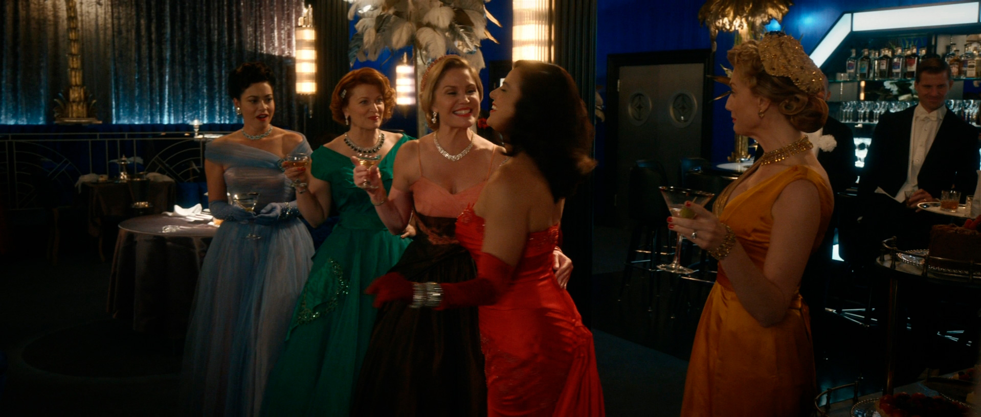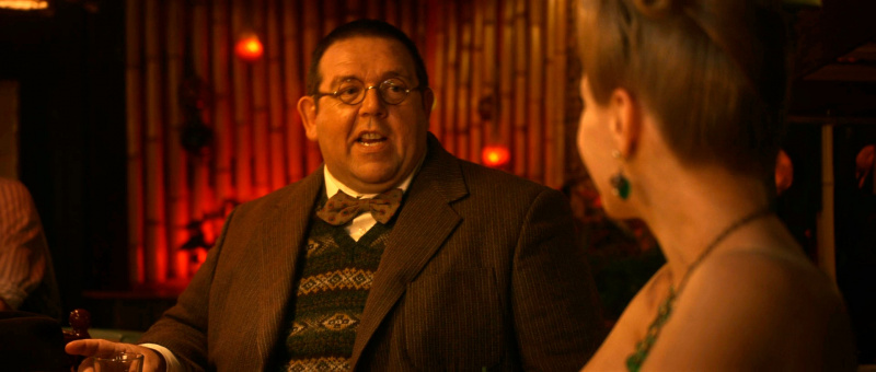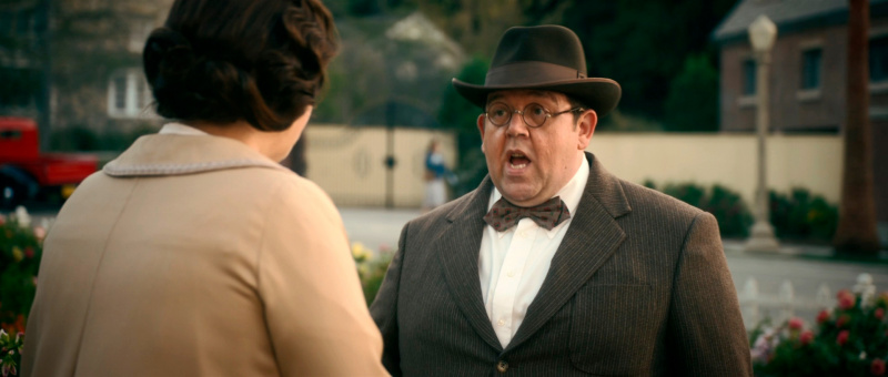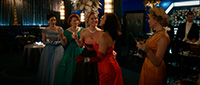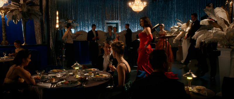 С точки зрения воссоздания обстановки и особенно костюмов здесь все сделано прямо-таки здорово. Нет, оно все, конечно, смотрится несколько мультяшно - как аналогичный элитный клуб во втором эпизоде "Ванда/Вижн", но это сознательно сделанное буйство красок и эффектных платьев - просто визуальный пир для глаз.