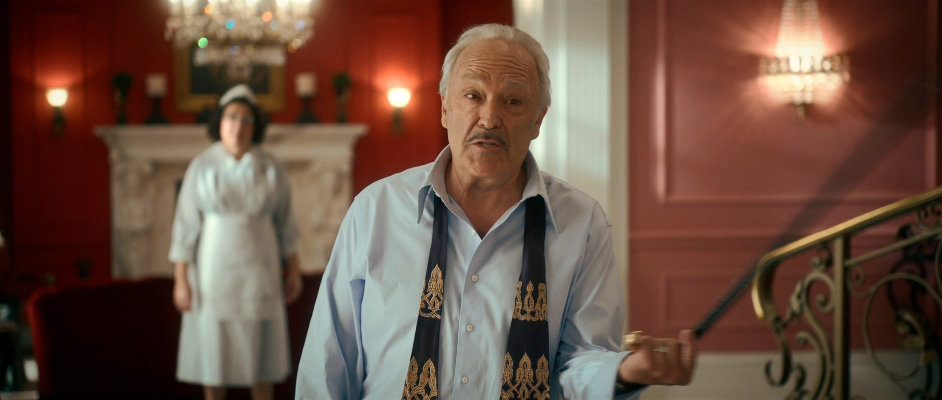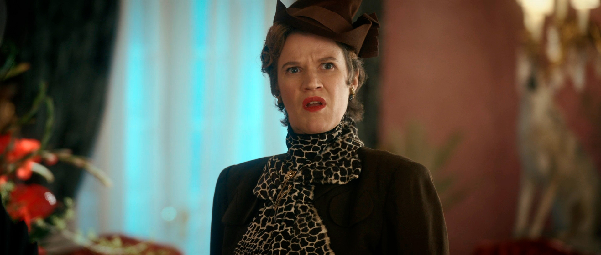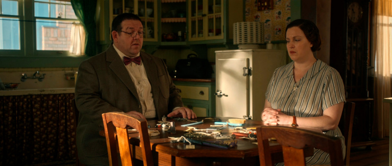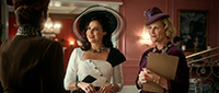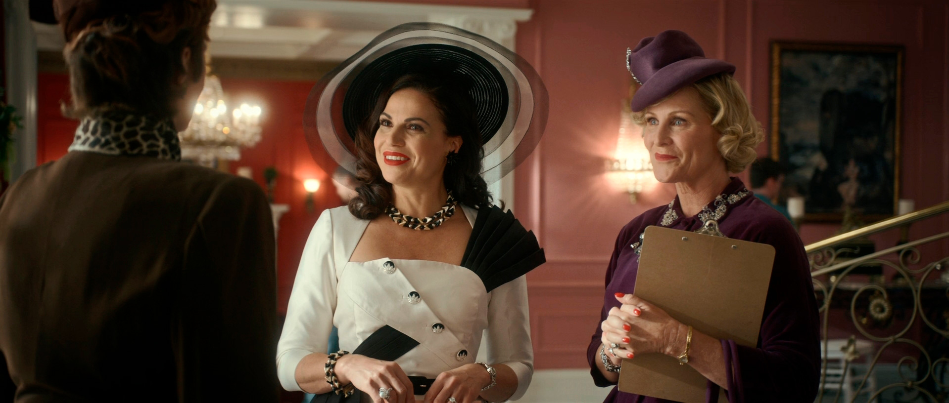 С точки зрения воссоздания обстановки и особенно костюмов здесь все сделано прямо-таки здорово. Нет, оно все, конечно, смотрится несколько мультяшно - как аналогичный элитный клуб во втором эпизоде "Ванда/Вижн", но это сознательно сделанное буйство красок и эффектных платьев - просто визуальный пир для глаз.