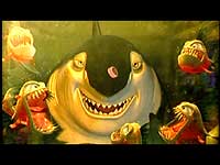 И вот тут все смешалось в раковине рака-отшельника! Эрни и Берни ушли на дно, чтобы показать Оскару, где раки зимуют! Туда же приплыли сыновья дона Лино, чтобы Фрэнки потренировал Ленни совершить королевский акулий заглот - как у реальных хищников. Но тренерская ноша оказалась слишком тяжела для Фрэнки, и он умер, как громом пораженный якорем, свалившимся на него с небес. На месте внезапной смерти Фрэнки совершенно случайно оказался Оскар, и теперь Эрни и Берни считают, что Оскар круто замочил Фрэнки.
