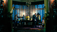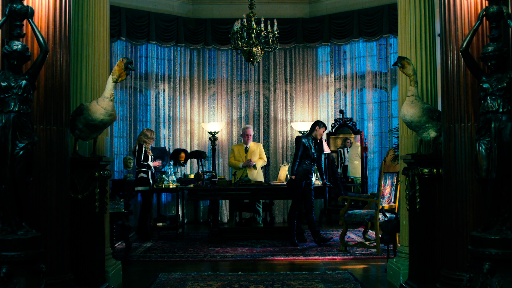 Но нам, повторюсь, даже понравилось. Потому что тут срабатывало абсолютное несоответствие персонажей двух разных направлений картины, когда они сталкивались. Сцена, когда Черный Кайзер, фигура абсолютно трагичная, драматичная и бесконечно угрожающая, как эдакий бог возмездия, идет разбираться с Блутом, а Блут - эдакий колобок - суетится в своем карикатурном кабинетике в своем попугайском костюмчике, хватаясь то за пистолет, то за меч, странным образом выглядит вот прямо-таки очень забавно!