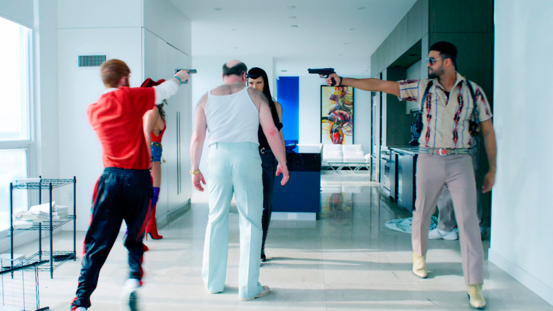 Однако фильм решен в несколько ином ключе. По стилю он напоминает некую смесь из "Города грехов" с несколько безумными цветовыми и постановочными решениями из "Адреналина" со Стэйтемом. Одновременно при просмотре в голове тут же всплывает незабвенный "Коммандос" со Шварценеггером, причем в начале "Полярного" есть прямо-таки конкретные пересечения с этим фильмом: вышедший в отставку главный герой, живущий в бревенчатом домике в лесной глуши; кто-то начинает убивать его сослуживцев (ну, скажем так, сокиллеров), о чем его предупреждают из организации; на главного героя нападает группа хорошо подготовленных людей; главному герою с оружием помогает симпатичная чернокожая девушка - в общем, похоже, да. (Впрочем, замечу, что дальше там все развивается совсем по-другому.)