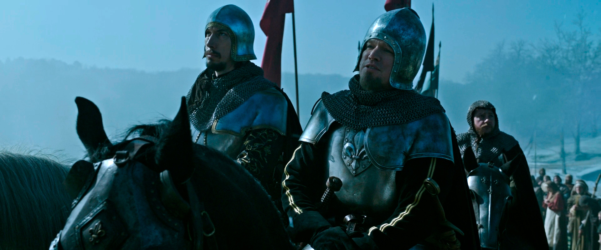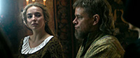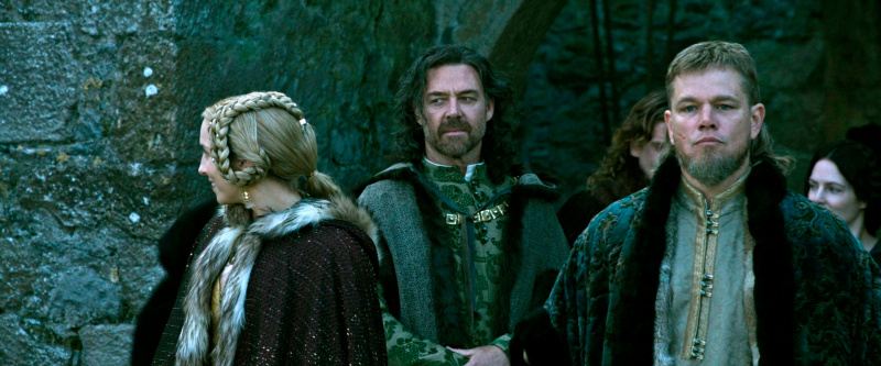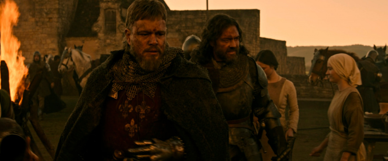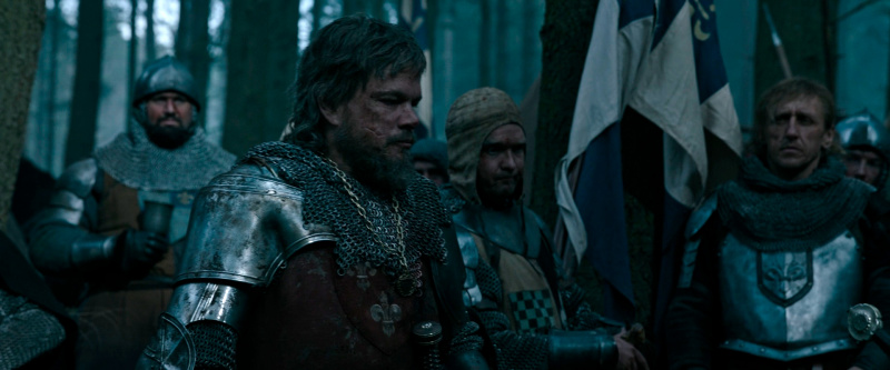 У Мэтта Дэймона Жан де Карруж получился эдаким звезд с неба не хватающим, но бесстрашным воином, который на полях сражений чувствовал себя значительно увереннее, чем в обычной жизни, где он испытывал финансовые трудности и, по его мнению, терпел различные несправедливости со стороны как других людей, так и собственного отца, который не считал сына достойным стать капитаном гарнизона. Жан пытался добиться справедливости через суд, но когда ты судишься со значительно более высокопоставленным аристократом, к тому же еще кузеном короля, то шансов у тебя никаких. Но Жан все равно ввязывается в это безнадежное дело - ну такой у него характер.