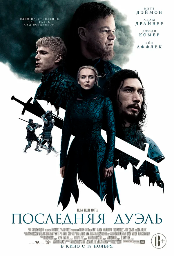 Так что в итоге у него получилось с "Последней дуэлью"? Вот тут, к счастью, все далеко не так плохо, как с "Робин Гудом". Здесь применен интересный, хотя и не сказать что совсем новый подход (впервые он вроде как был применен в фильме Куросавы "Расёмон"): фильм разделен на несколько частей, в каждой из которых соответствующие события излагаются с точки зрения трех основных персонажей - де Карружа, Ле Гри и Маргариты. Ну и, разумеется, их взгляды на события будут заметно отличаться.