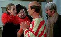 В фильме - "как бы" - говорят на нескольких языках: испанский, французский, английский, итальянский, русский, немецкий, норвежский и латынь. Но единственный нормальный язык, который там звучит, - это закадровый английский (в разных версиях фильма это был шведский, датский, норвежский и французский), а все остальные языки, на которых говорят персонажи фильма, - это такой же веселый дурдом, как и то, что вообще творится на экране: в основном эти "языки" представляют собой отрывистые слова, к тому же часто заимствованные из других языков.