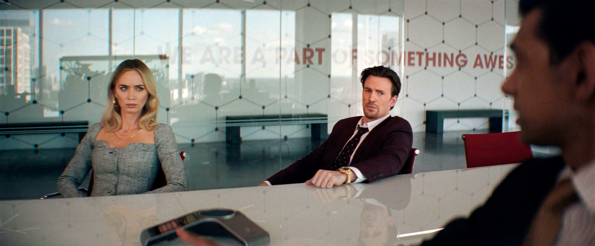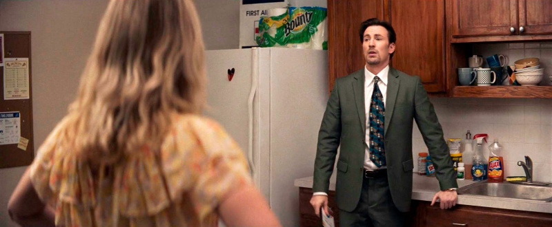 У Криса Эванса тут скорее отрицательный персонаж. Пит - эдакий акула-продажник: напористый, циничный, не склонный ни к какой рефлексии. Оно, конечно, продажники и должны таким быть, это их работа, но, с другой, надо все-таки думать, что ты продаешь, и какие последствия это вызывает для многих людей. Эванс с ролью справился хорошо, ну и порадовало то, что обычно идеальная прическа, которую у Эванса имеют почти все его персонажи, здесь такая слегка растрепанная.