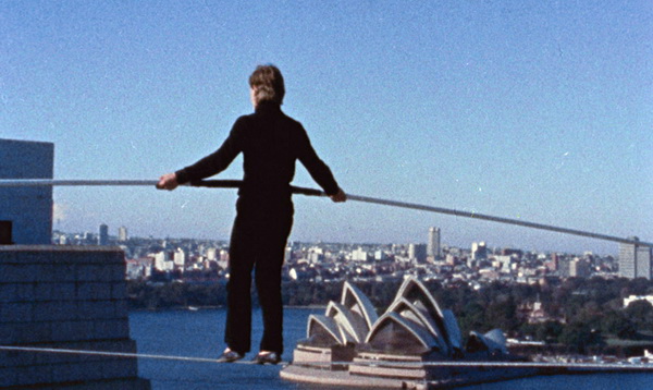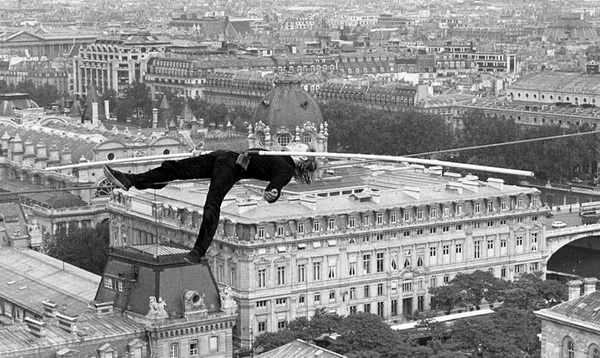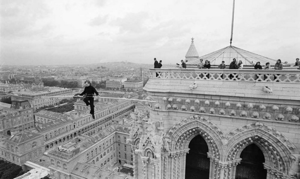 Ну и несколько фотографий реального Филиппа Пети в момент исполнения его знаменитых проходов по канату.