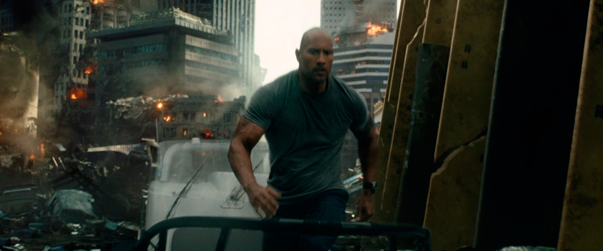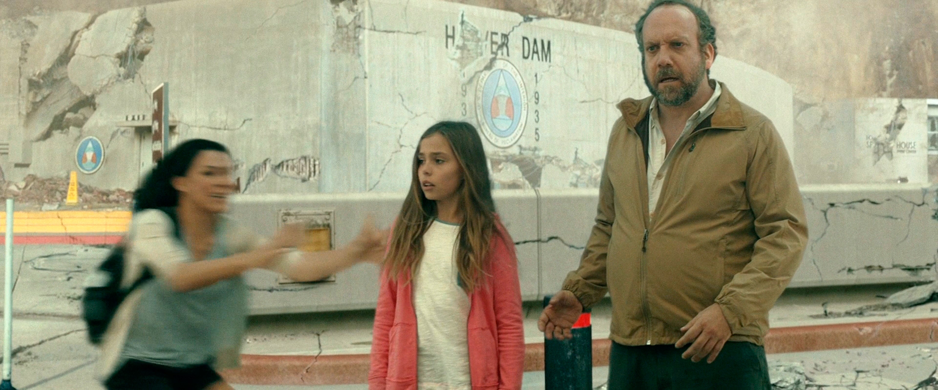 Перед этим Лос-Анджелес тоже сильно затрясло и папа Рэй на своем боевом вертолете отправился спасать жену Эмму, каковую он счастливо спас с крыши обрушившегося здания.