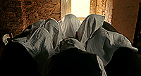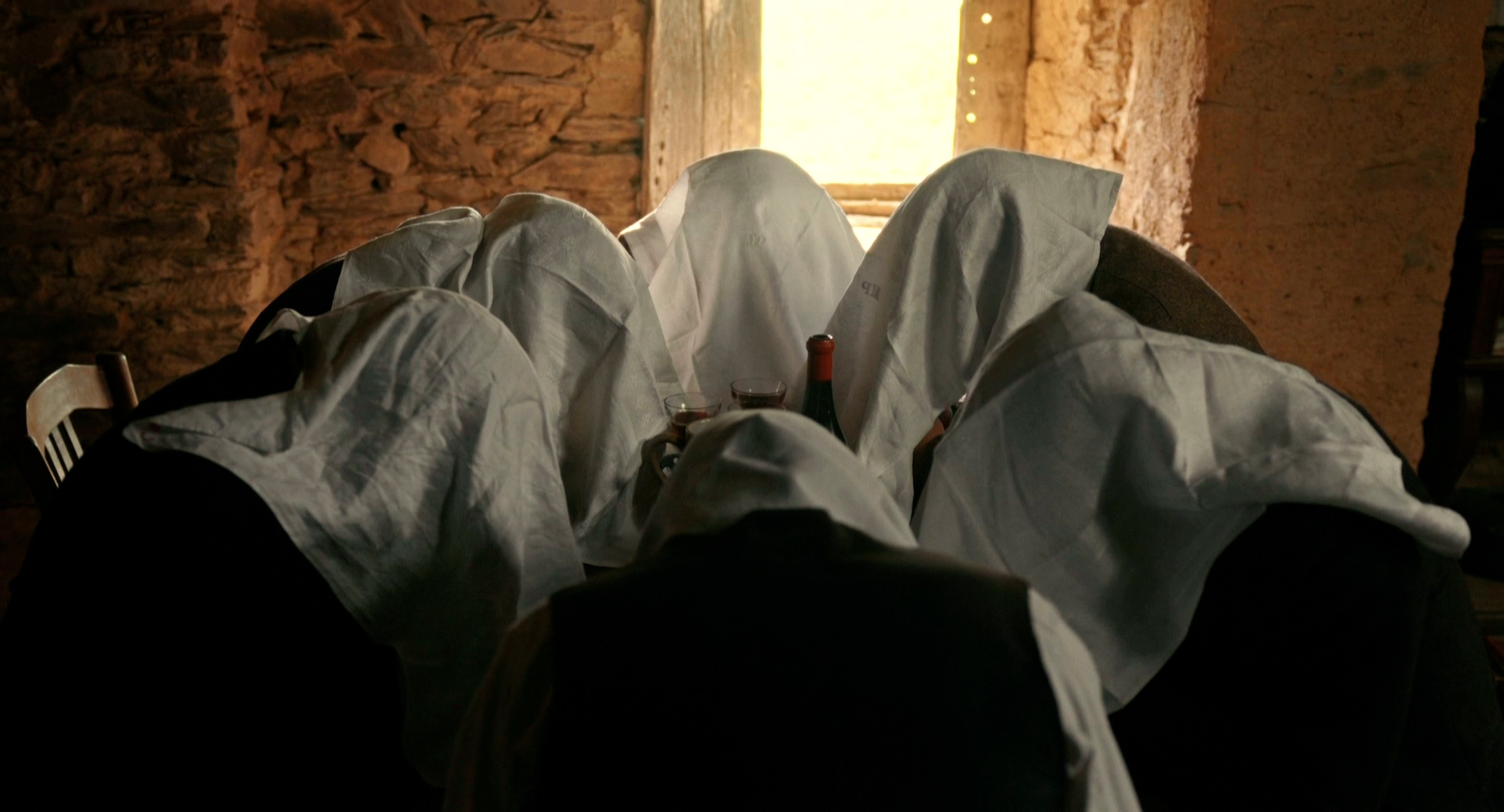 Оказалось, что на юго-западе Франции действительно есть такая традиция. Объяснения этому даются очень разные: чтобы едок мог незаметно выплевывать кости, чтобы скрывать жир, текущий по щекам едоков, ну и самое интересное объяснение - чтобы скрыть это роскошество от глаз бога.