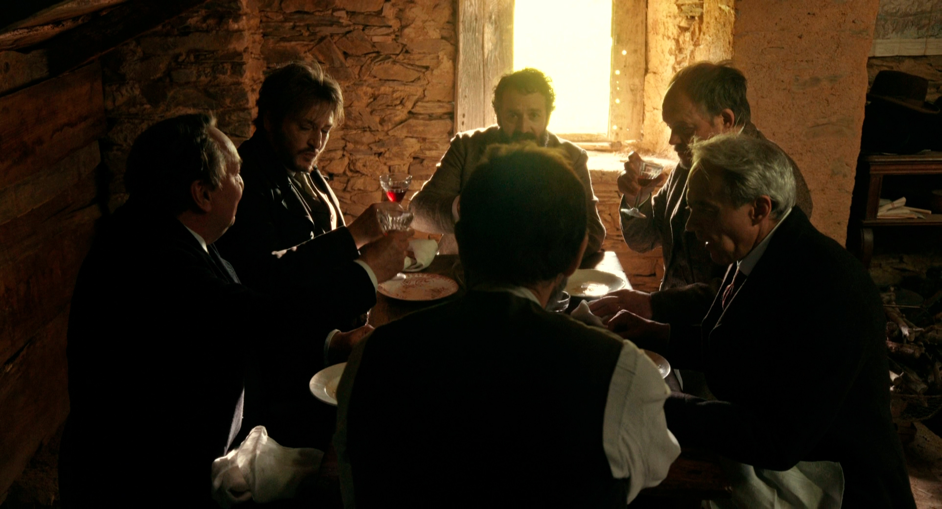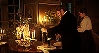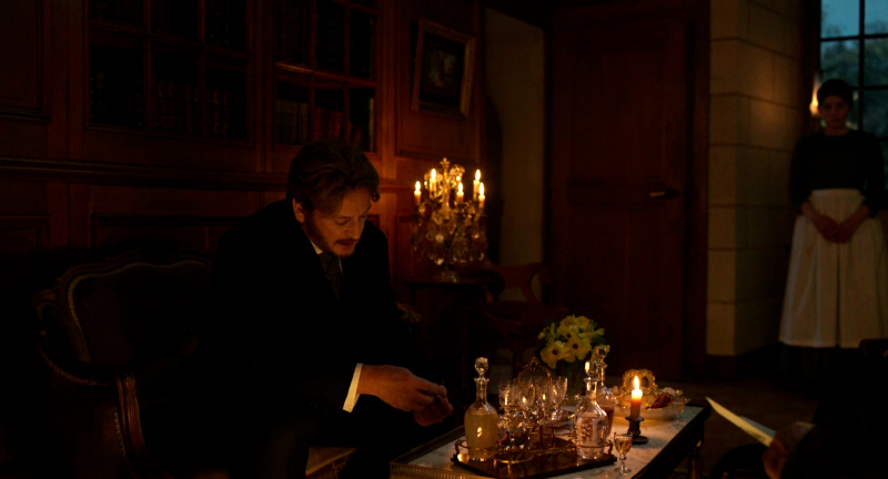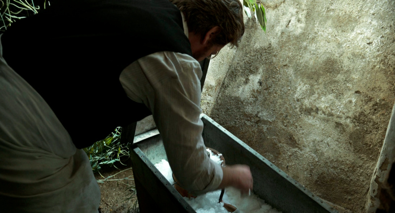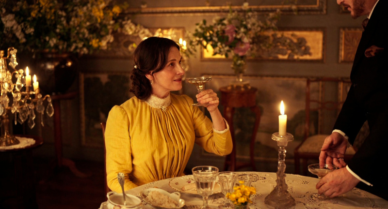 И там есть изумительный эпизод, как Доден, когда Эжени уже не выходит из своей комнаты, устраивает ей роскошный ужин, пуская в ход все свое мастерство, чтобы продемонстрировать ей свою любовь через те блюда, которые он для нее готовит. Она уже почти не может есть, но она все пробует, потому что понимает, что это сделано специально для нее. И Буффан просит разрешения присутствовать рядом, чтобы просто посмотреть, как она ест его блюда. И он для нее откупоривает уникальную бутылку шампанского Krug, которая 50 лет пролежала на морском дне - оно стоит каких-то безумных денег, но ему уже все равно, сколько это стоит.