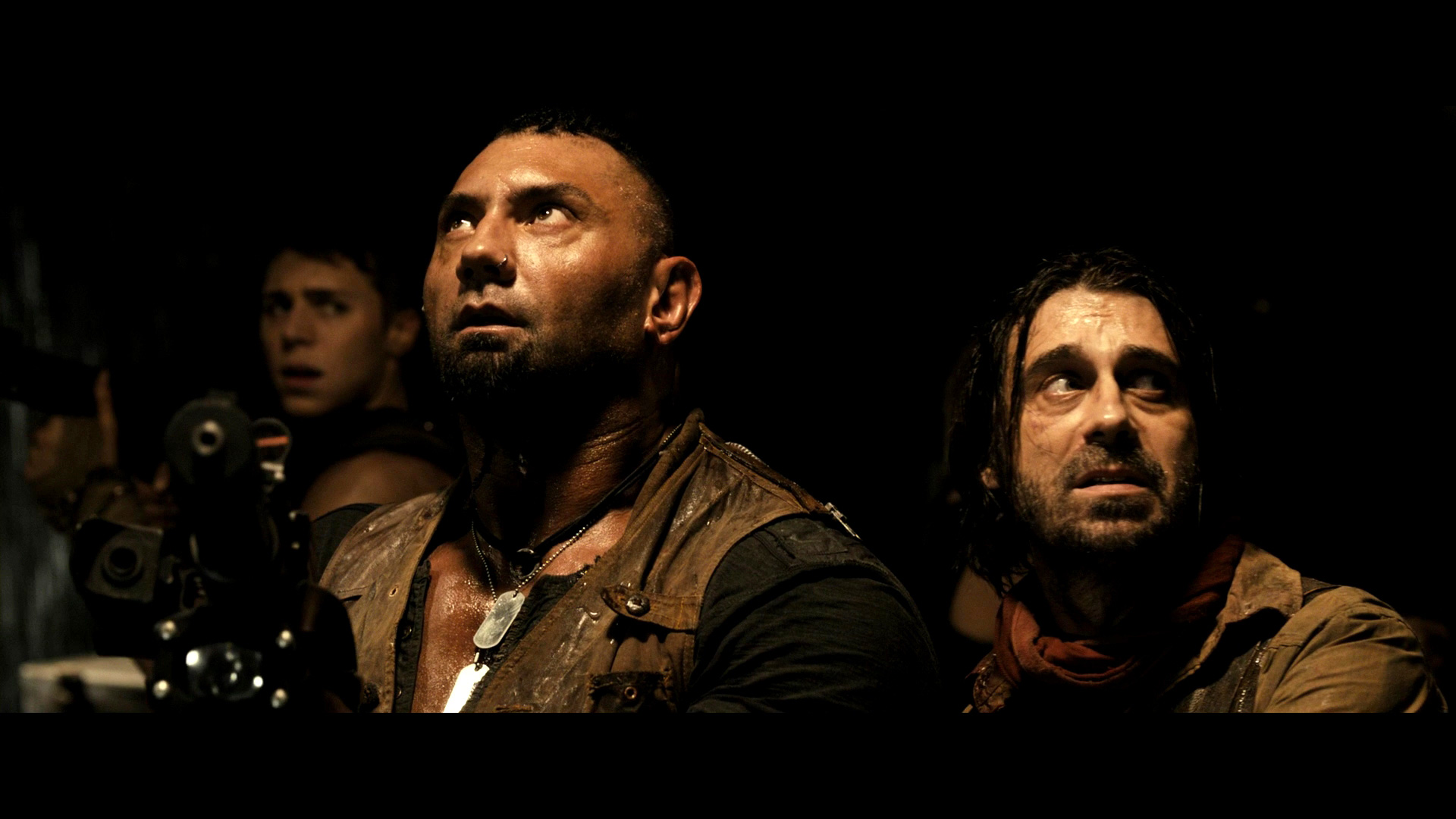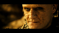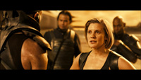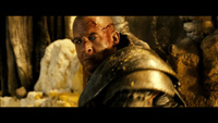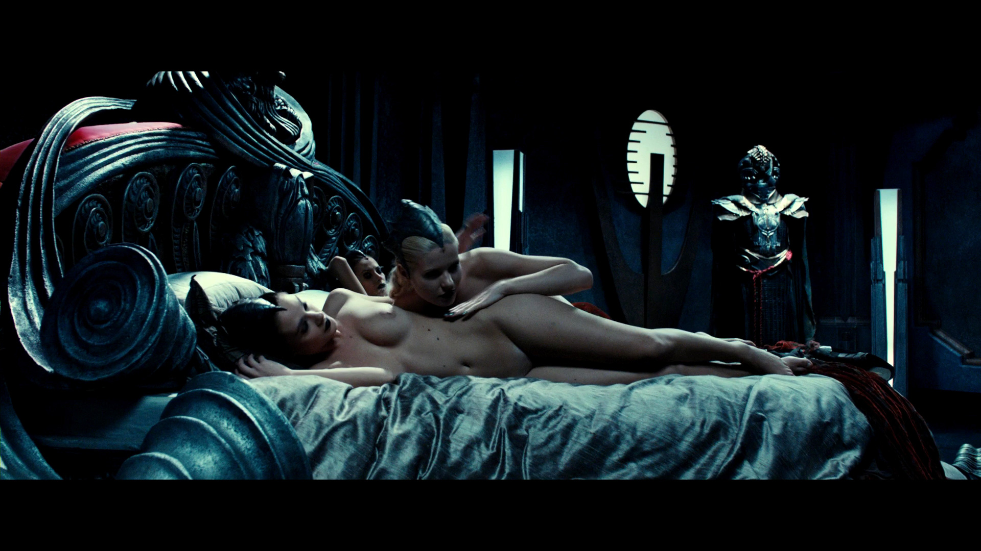 Но зато при этом можно было показать пару голых и синеватых теток (с цветовыми эффектами Туи не заморачивался: планета - желтая, некромонгеры - синие), которые валяются на ложе короля Риддика. А тот настолько крут, что даже на ложе с прекрасными синими девками не снимает свои знаменитые портки и майку-алкоголичку.