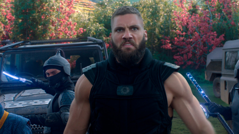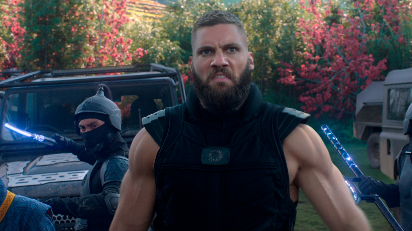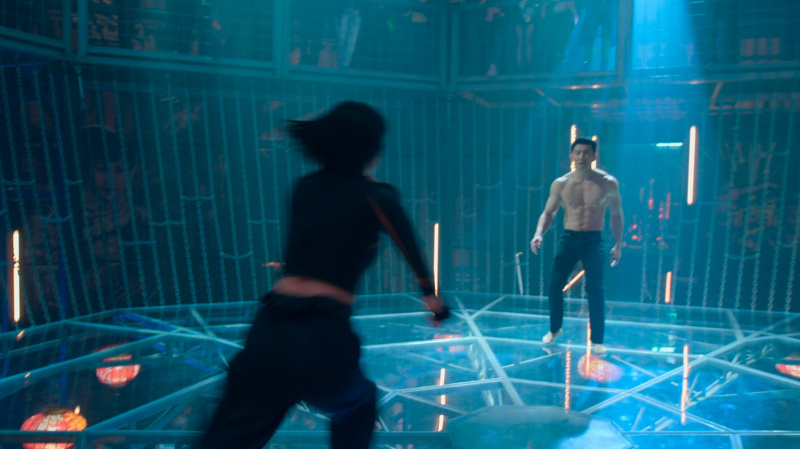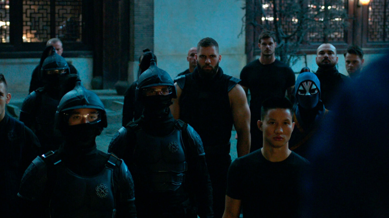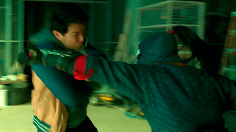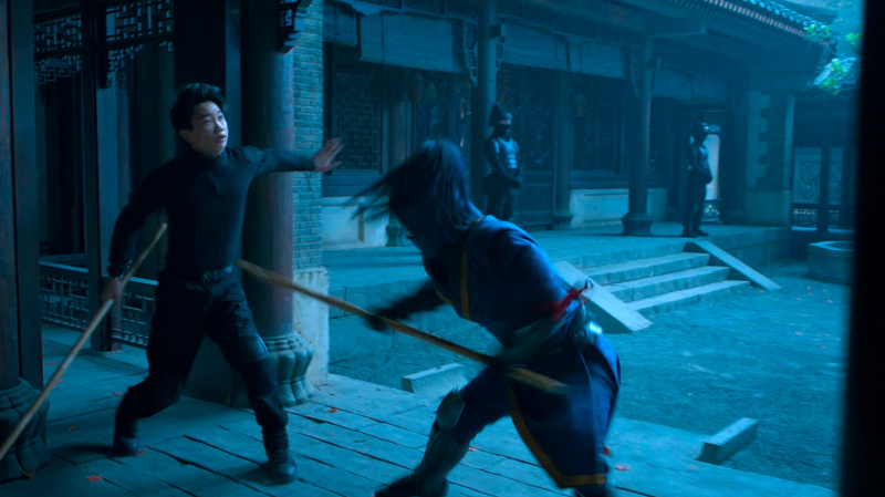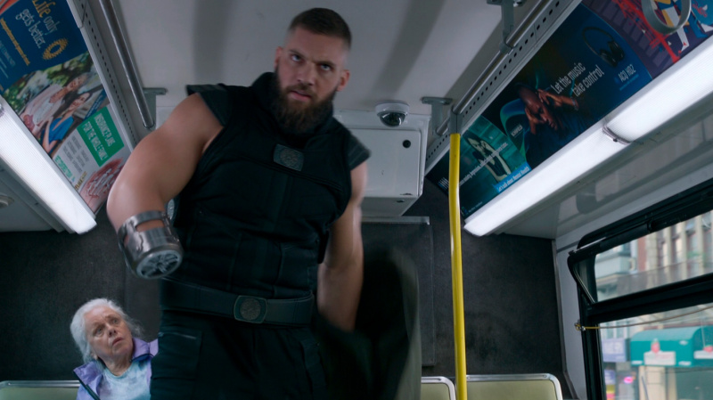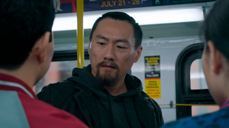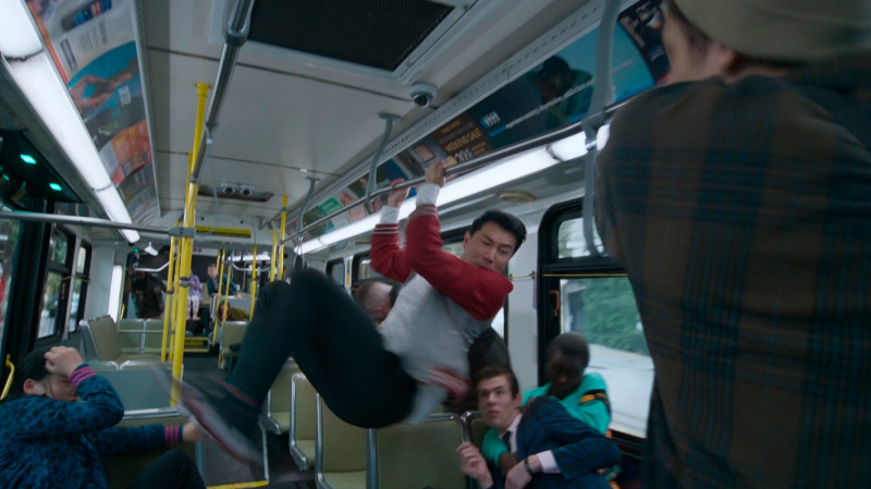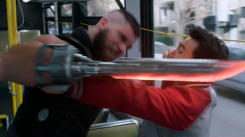 В какой-то момент все резко меняется, когда на едущих в автобусе Шан-Чи и Кэти нападает целая банда хорошо подготовленных людей, руководит которыми Бритвеный Кулак (Флориан Мунтяну) - огромный, атлетически сложенный румын, у которого из правой поврежденной руки выдвигается здоровенное лезвие.