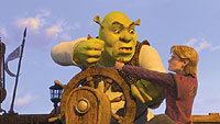 Теперь у Шрэка не получится просто так посадить Арти на трон. За трон придется сражаться, попутно освободив Фиону, которая как раз собралась подарить Шрэку штук пять шрэкунчиков, от чего у добродушного зеленого великана всю физиономию скособочило.