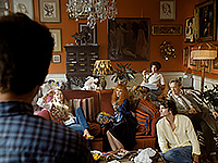 Но вернемся к самой постановке. Как я уже сказал, Эмеральд Феннел и здесь шатает туда-сюда - из жанра в жанр: в кинобазах картина отнесена к "драмам", но это что угодно, но не драма. Я бы ее охарактеризовал как черноюморную сатиру, но в фильме будет достаточно жанрового разнообразия. К костюмированной вечеринке постановщица дойдет уже до конкретного гротескного абсурда, как будто бы она поставила перед собой задачу попробовать в данном произведении почти все, что она видела в чужих картинах.