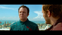 По поводу Зои Салданы я сначала боялся, что она тут устроит истеричную киллершу из "Коломбианы", но выяснилось, что, когда персонаж Салданы приобретает какой-нибудь яркий волнующий цвет - синий, как в "Аватаре", или зеленый, как здесь, она играет довольно прилично. Вот и здесь никак не раздражала. И я даже поверил в то, что Звездный Лорд в конце концов заинтересовался ее зелеными женскими прелестями: в конце концов, розовые прелести - в прямом смысле этого слова - у него уже были.