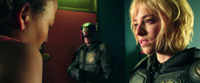 Понравилась Оливия Тирлби, сыгравшая стажерку Андерсон. Тут персонаж интересный. С одной стороны, нежный цветок душистых прерий, который непонятно как попал в судейские стажерки. С другой, она обладает редким и очень полезным даром - умеет читать мысли других. С третьей, несмотря на вроде бы неопасный вид, Андерсон уже к середине мочилова начинает действовать успешно и эффективно. Прям так и видишь, что через некоторое время у нее сами собой опустятся уголки губ, она наденет на голову шлем, как у Дредда (ну да, он мешает читать мысли, но что там читать - надо стрелять), - и станет еще одним успешным Судьей, пока ее не разорвет выстрелом из бандитской базуки и она сгорит на работе.