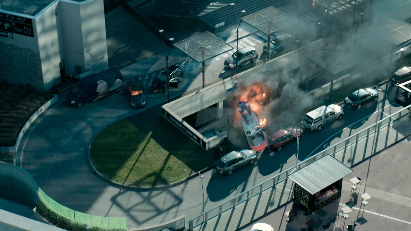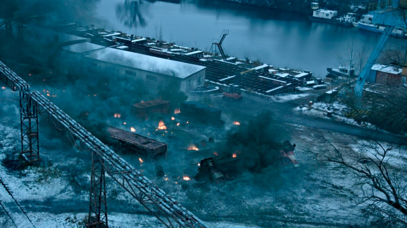 А вот финальная "сцена на заводе", которая на самом деле была в церкви - она очень так себе: предельно заштампованная и блёклая. Но она короткая, а настоящая "сцена на заводе" - это войнушка в высотке в Донауплатте, которую снимали две недели, и ради которой власти города даже закрыли в этом районе несколько предприятий, в том числе - детский сад.